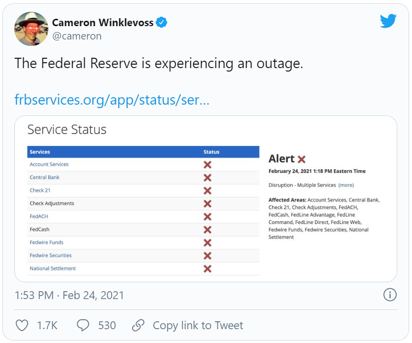 It wasn’t just Fedwire, FedCash, Central Bank, or any of the other services that act as the backbone for the Federal Reserve financial network, it was the entire suite of services.