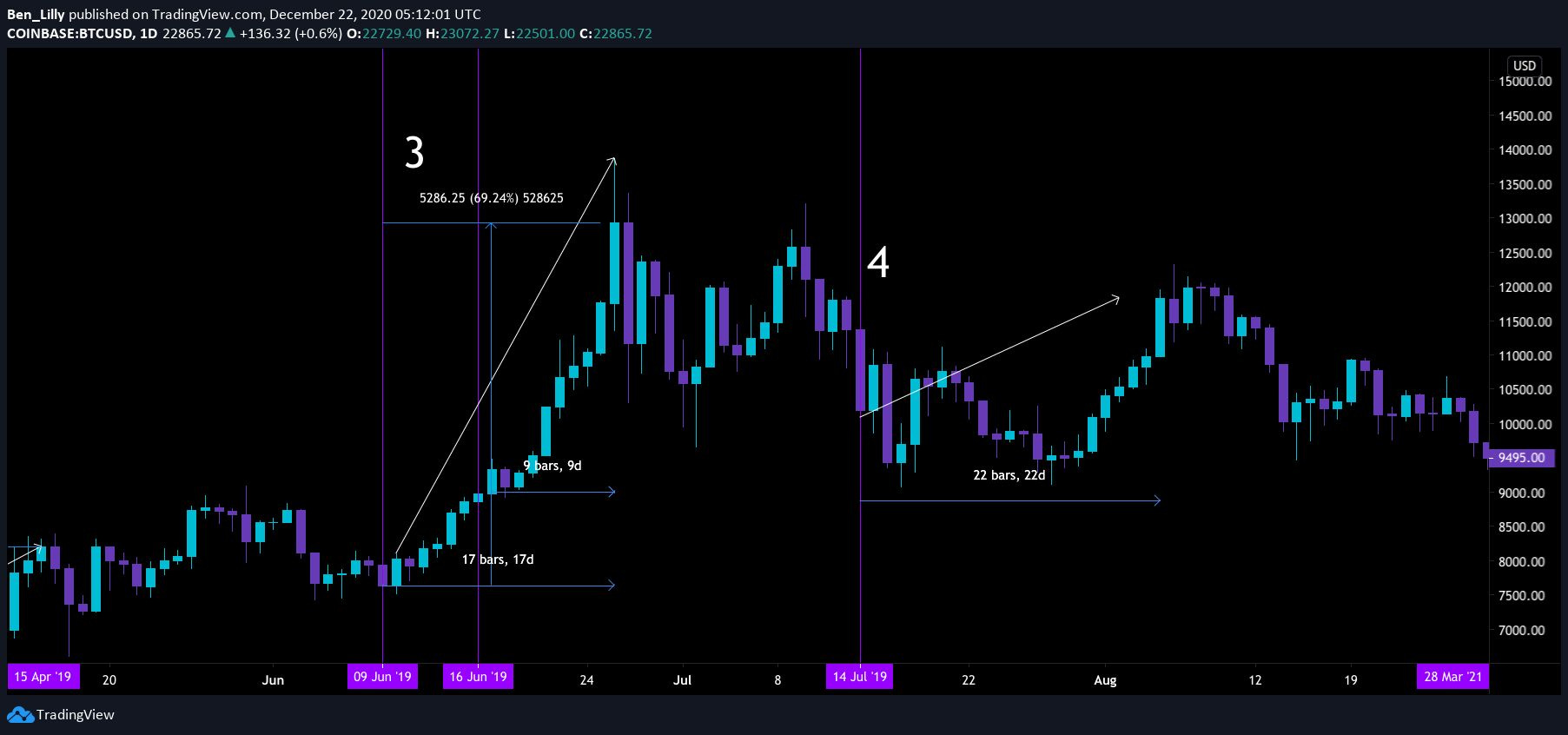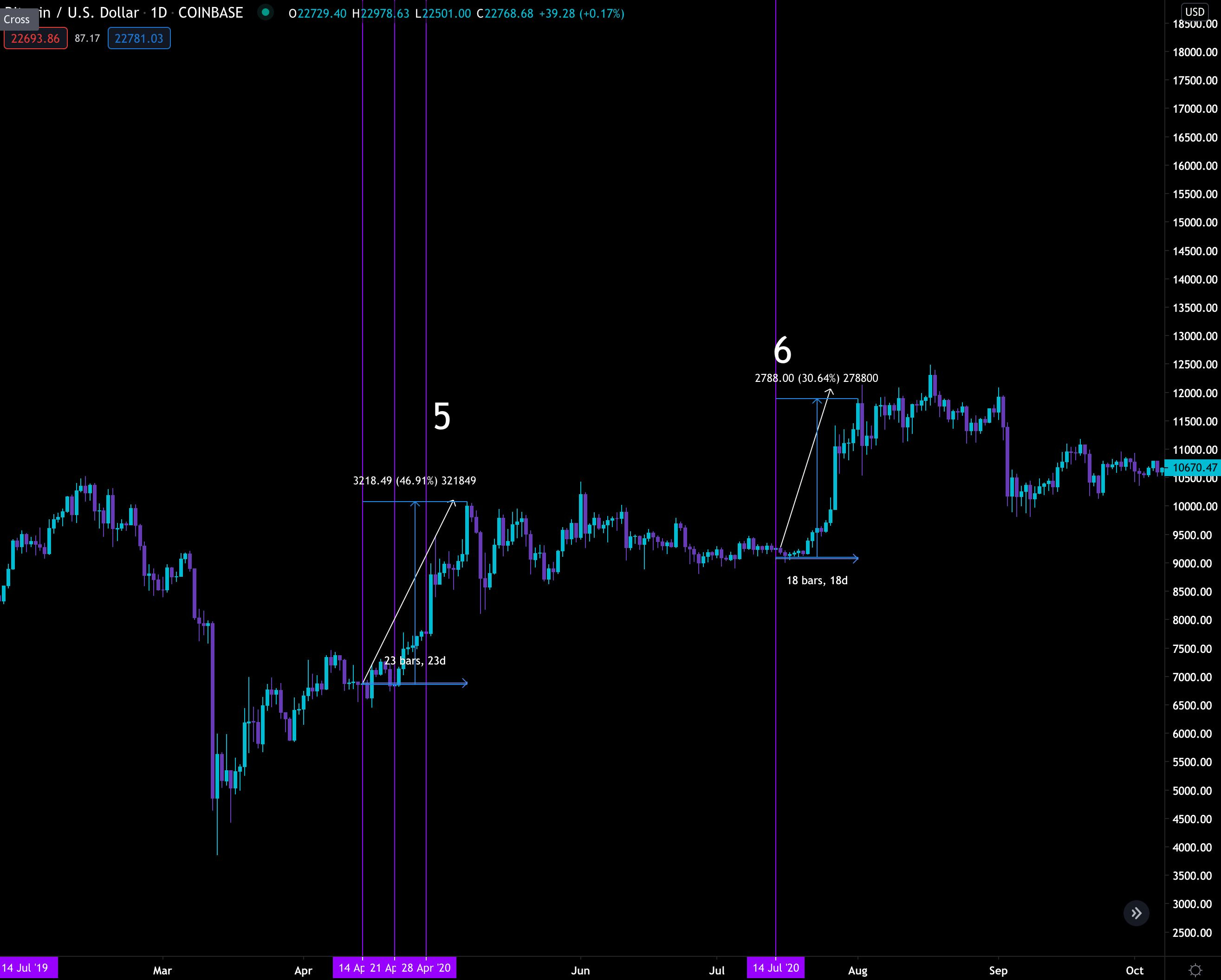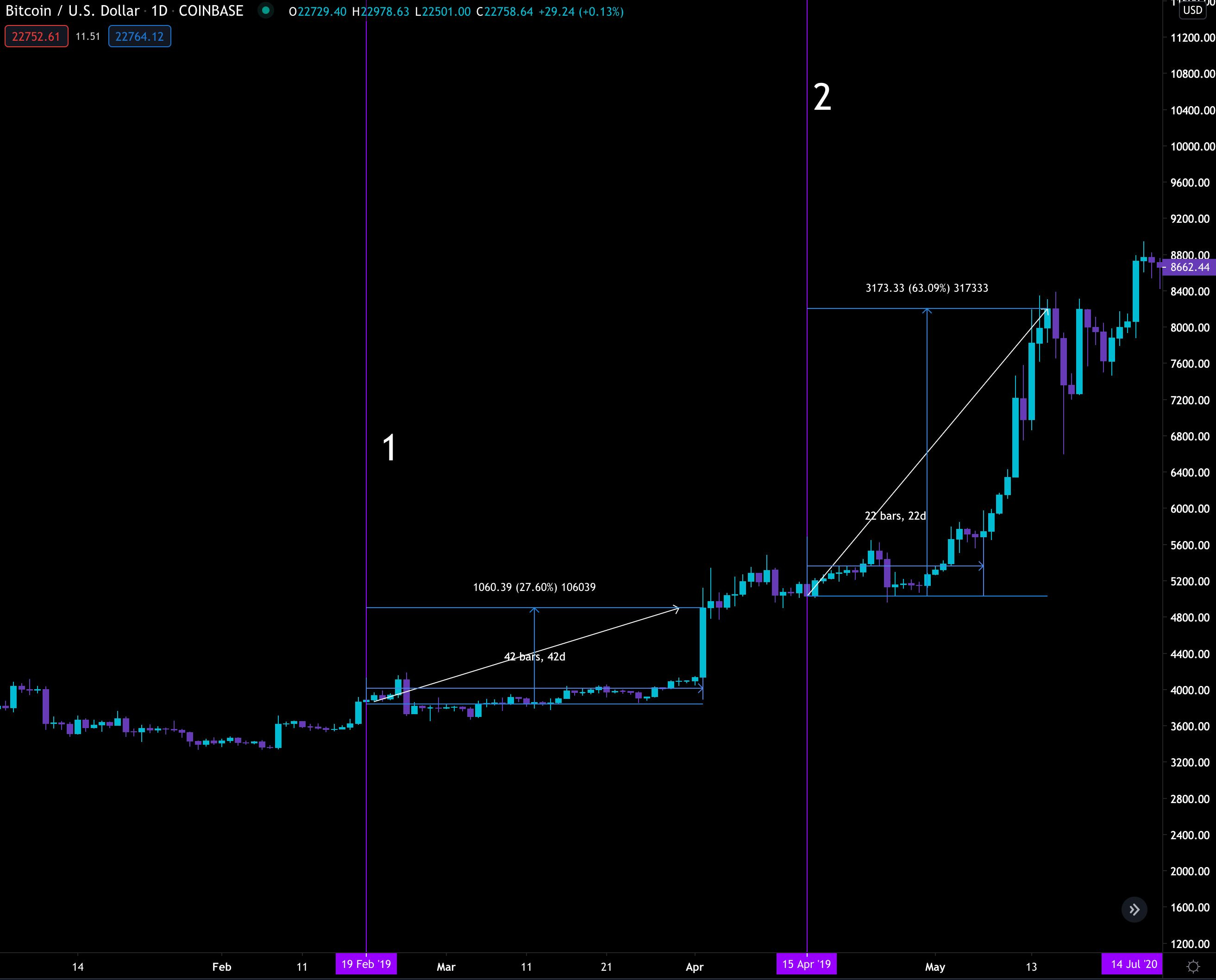Now where things get interesting is after each unlocking event. As you'll see, BTC has noticeable moves every single time. Here's the price shortly after the first two tranches.