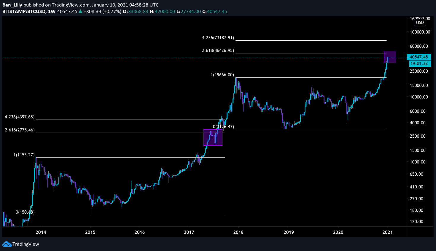 Now, I'm not a big time believer in fibs, my thoughts on this are two fold. First, crypto is in no man's land when it comes to price discovery. None of us really know how much a network like Ethereum is going to be worth in four or five years from now. There's just no comparable. This isn't a car manufacturer with cash flow and earnings. It's a completely new animal. So to find price targets one of the few tools at our disposal is fib extensions.