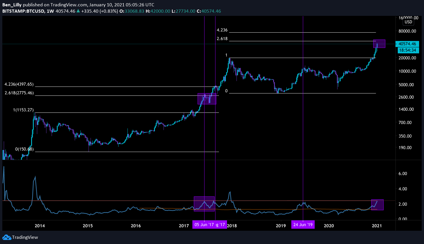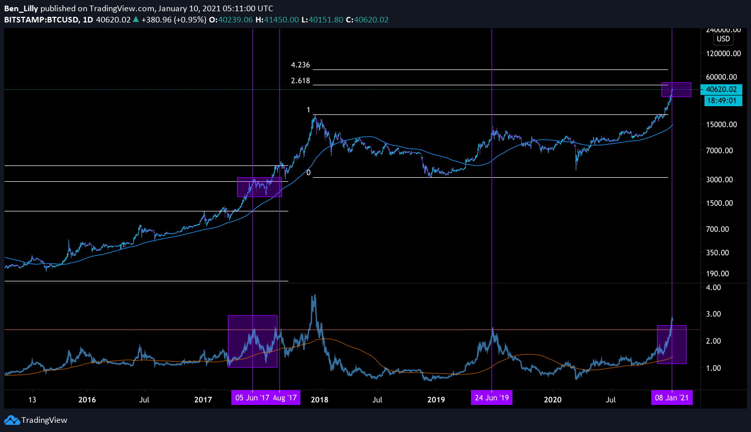 The Mayer Multiple is a way to look at the price of bitcoin in relation to past price. Specifically, it's 200 average. Bitcoin last closed around $40,300 and the 200 day moving average is $14,709. Divide the two and you get 2.74, that's the Mayer Multiple.