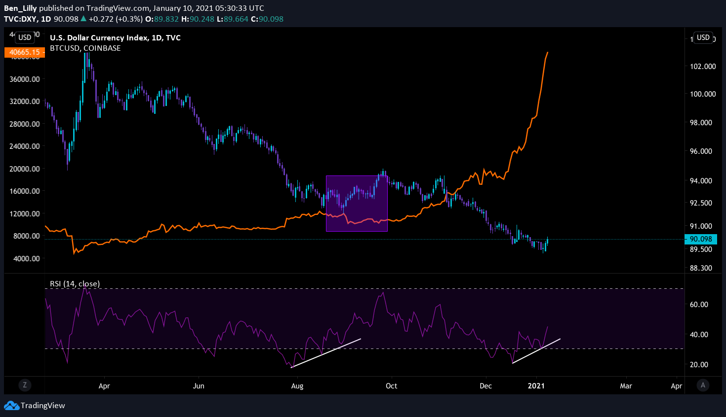 One of the biggest theses on bitcoin is a hedge against the dollar. Meaning if the DXY (US dollar index) decides to go on a bit of run for a few days, we might see something similar to what we saw in Q3 2020. At the time DXY was getting crushed. The price had dropped so low it was getting overextended, meaning it needed to cool down. The white trend line was showing a potential mini run could happen. When it eventually did, bitcoin (orange line) took a hit.