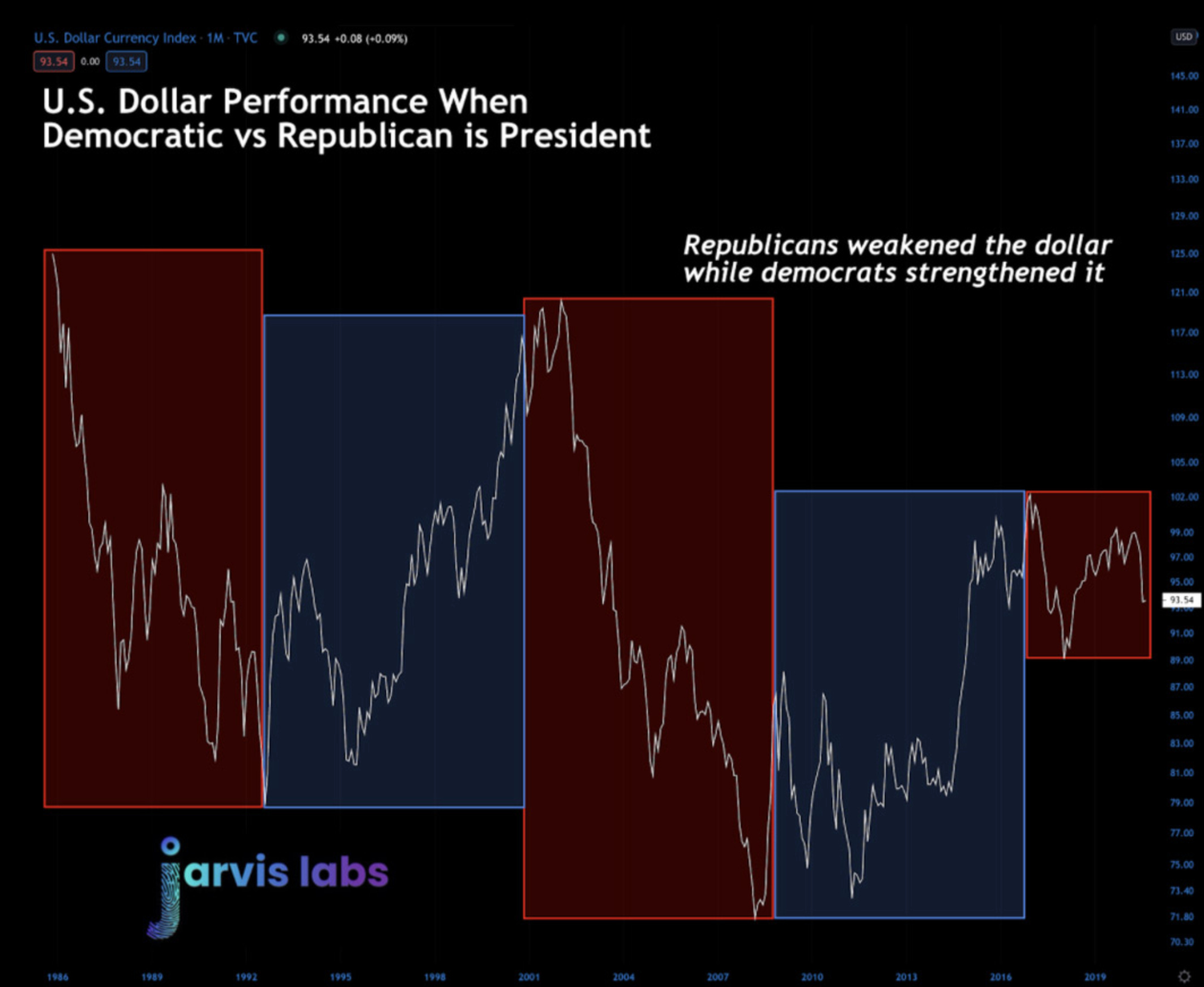 It highlights how the DXY behaved when Republicans and Democrats were in office. I'm beginning to take a renewed focus on U.S. fiscal and monetary policy in the next few weeks because any strong, impulsive move on DXY to the upside could really bring BTC down a peg or two.
