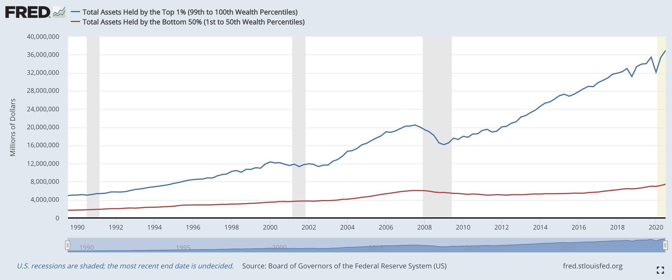 Said differently, the rich have a lot of cash they have stuffed away. Here's a chart of total assets held by the top 1% versus the assets held by the bottom 50% of U.S. household.