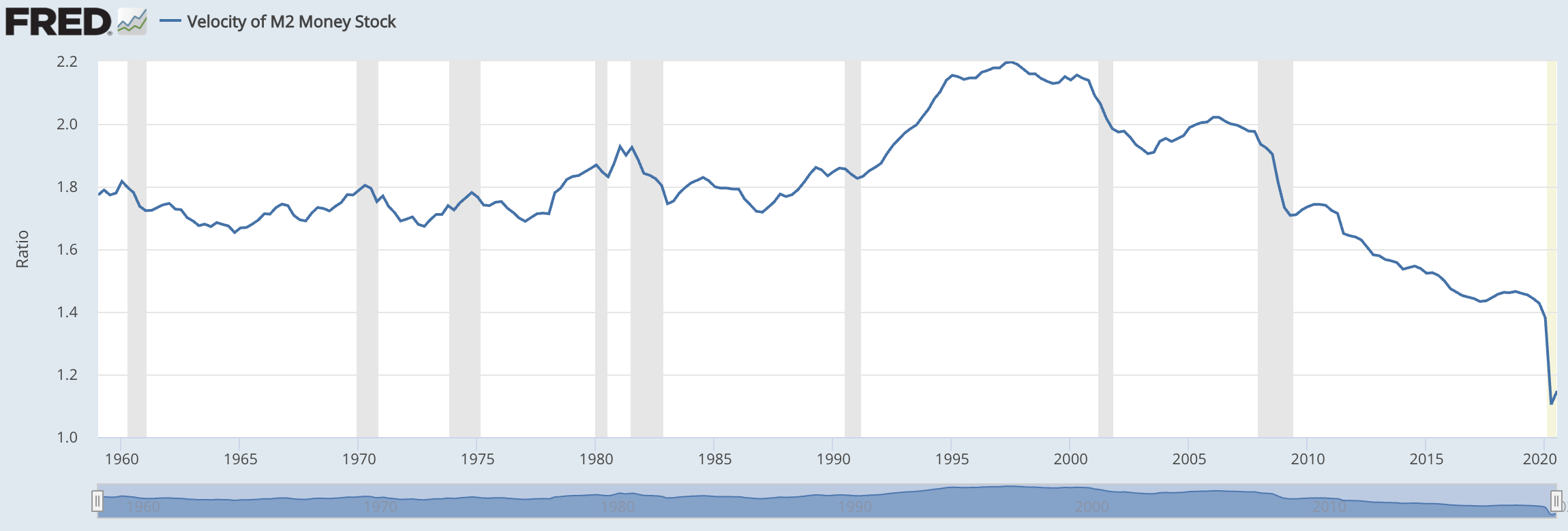 A quick look at M2 velocity, which can be interpreted as the churn of money through the system... ie - you get paid, then you pay the gardener, the gardener buys some food, the sandwich shop owner pays their employees... all with the same dollar. And with COVID you can see another reason why velocity might not be surfacing yet (and also why oil and market demand in general are weak - to support Powell).
