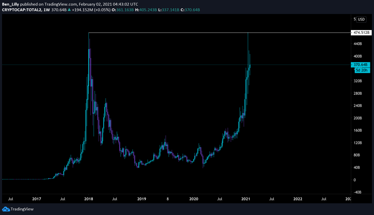 Now, here's an interesting chart I pulled up... It's "TOTAL2" on tradingview. This is the market cap of crypto MINUS the market cap of bitcoin. Aka it's the altcoin market cap.