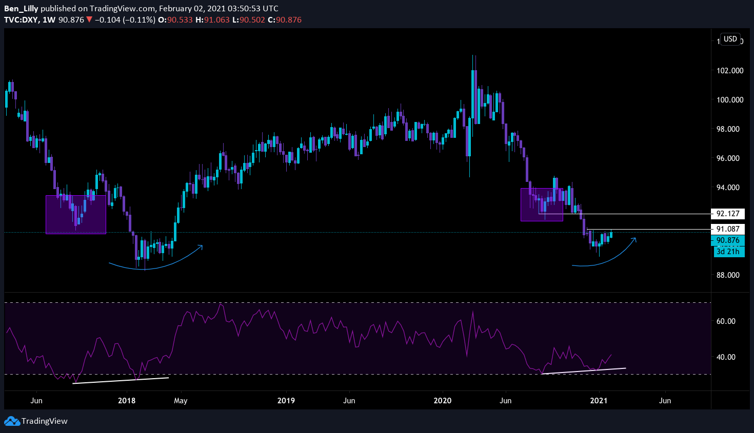 We saw a similar pattern unfold for DXY in early 2018. This time around the main difference is the market isn't really expecting it. That's why it's a bit too early to look at such a major swing. It's a bit easier to zoom in a bit and see what area to focus on for the time being..