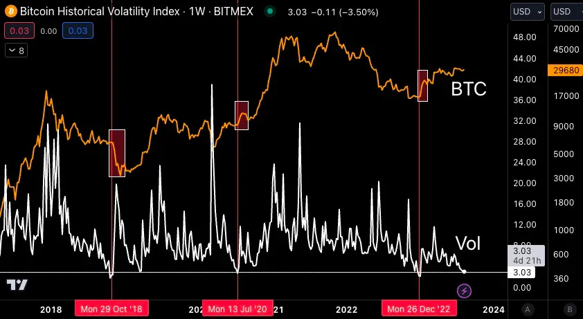 It’s all in the chart he shared below, which shows Bitcoin’s historical volatility index (BVOL, white line) overlaid with Bitcoin’s price (orange line). Today’s volatility has only been this low three times before, marked by the vertical red lines, which eventually triggered big moves in BTC (red boxes).