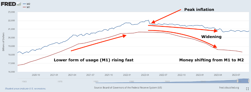 To showcase this further using money supply definitions, we can look at the chart below. We can see on the right side of the chart that in June 2022, inflation was “tamed.” What also happened here in terms of money supply definition is M1 (red line) began to shrink faster than M2 (blue line).