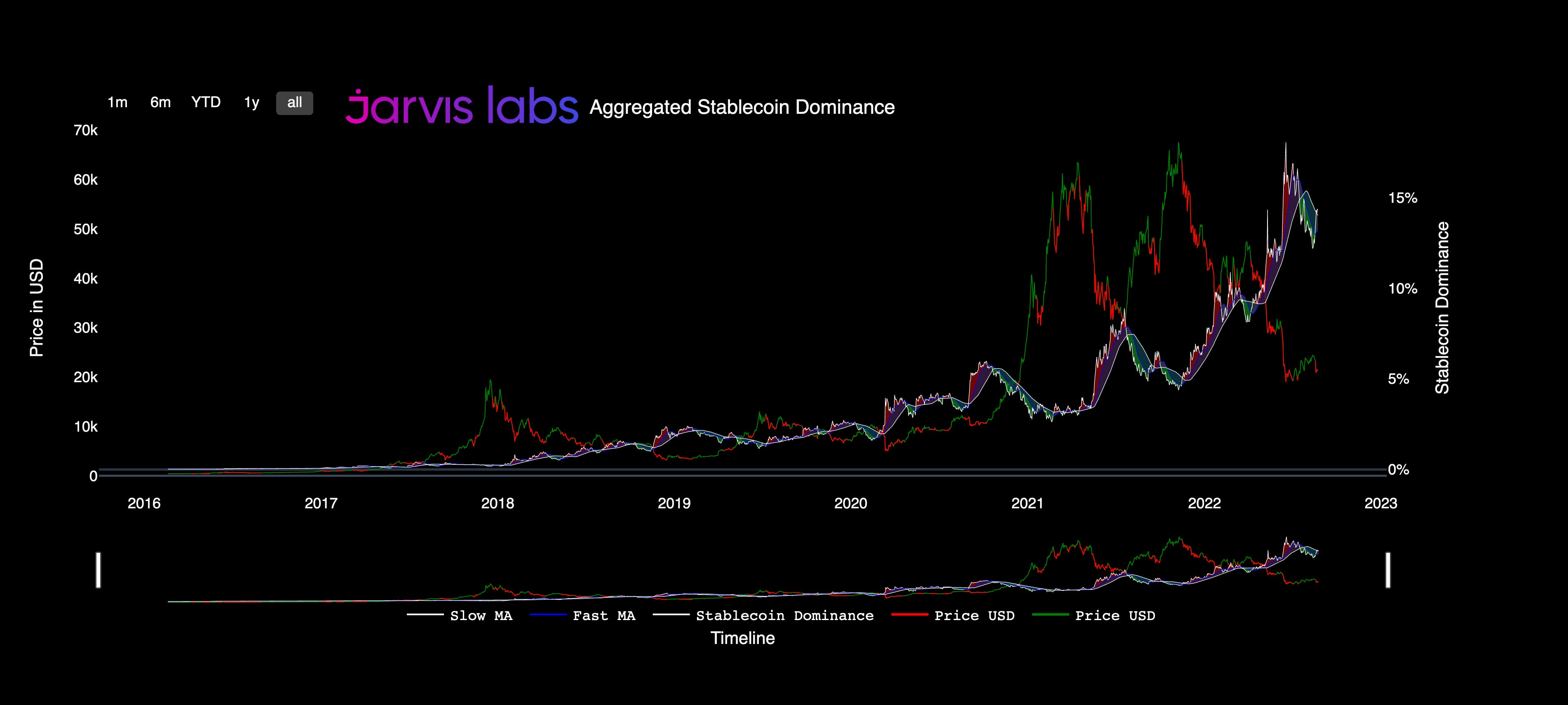 On the first chart below, the red arrows show instances of major price crashes. Unsurprisingly, each one has syncs up precisely with large rises in stablecoin dominance.