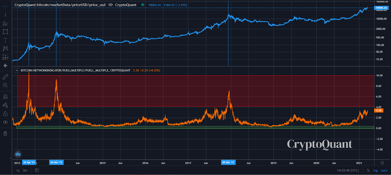 Essentially, whenever the PM goes above 4 price tends to just go bonkers. This happened once in the last halving cycle and twice in the cycle before.