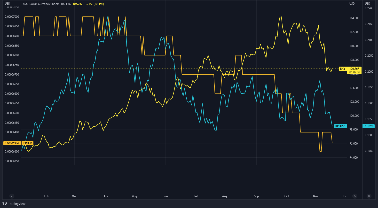 But even countries with rich natural resources have seen their currencies drop sharply against USD. Below, we have a chart for DXY versus the Indonesian rupiah (IDR, orange line) and the Brazilian real (BRL, blue line).