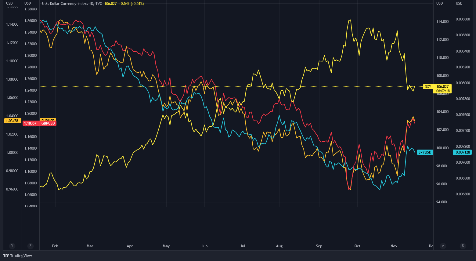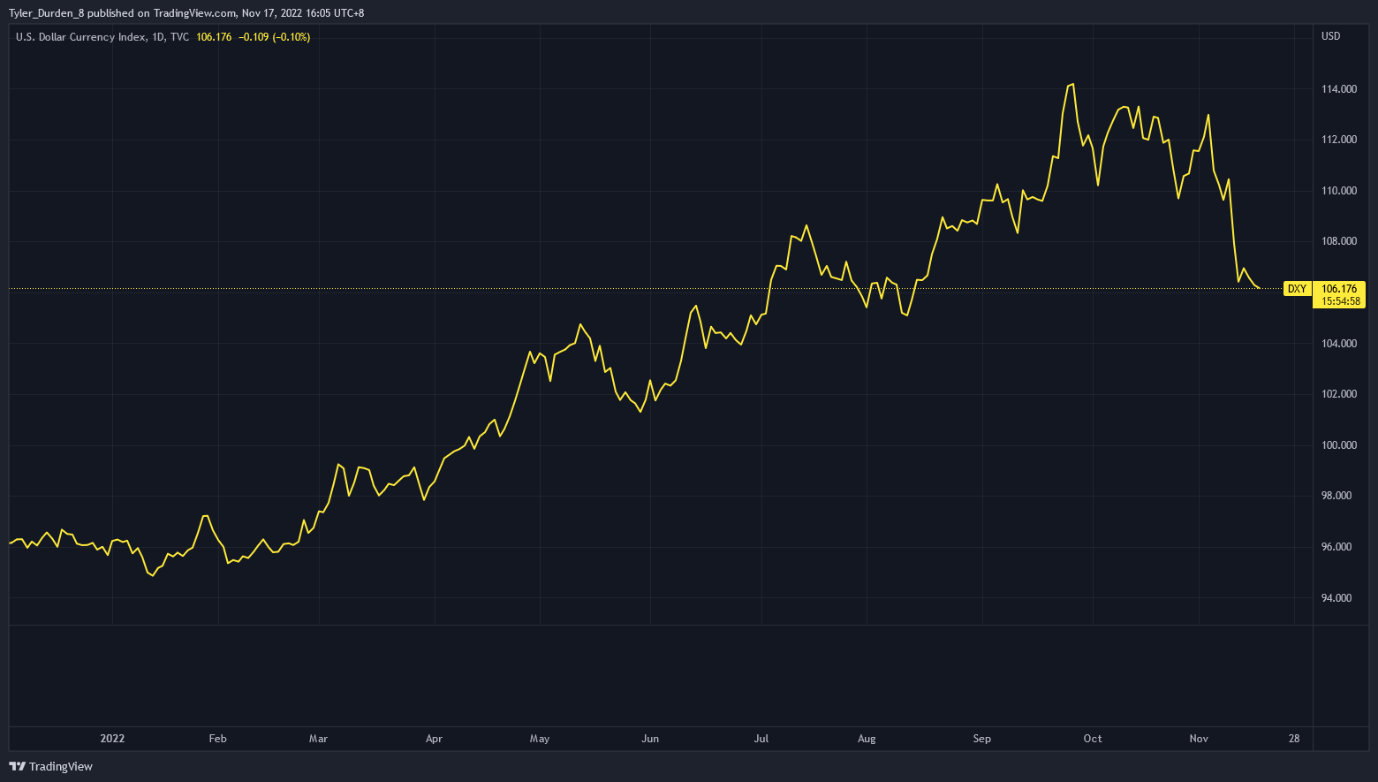 At the time of writing, DXY dropped from above 110 to 106, possibly due to inflation coming in at 7.7% in October, which was lower than the expected 8%.