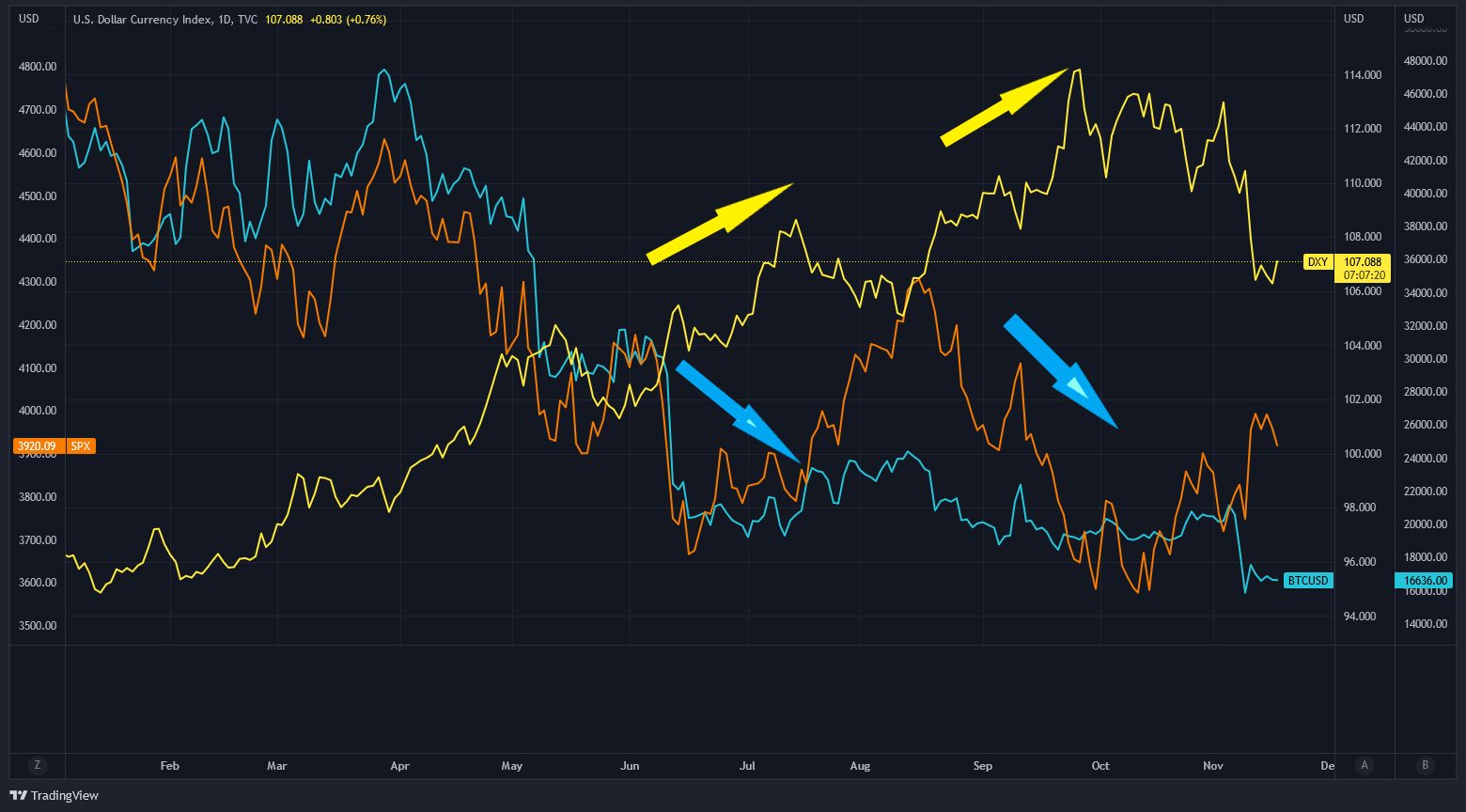 The correlation is quite pronounced. As DXY climbed higher, the S&P 500 (SPX, orange line) and Bitcoin (BTC, blue line) got hammered. As DXY corrected, SPX and BTC started to mount a comeback – except at the moment, the FTX fallout is hindering BTC.