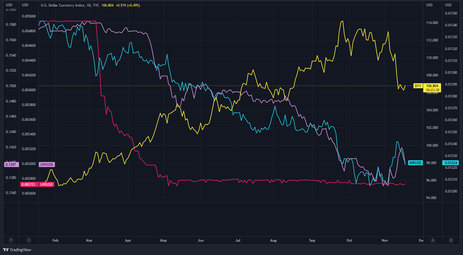 As an example, the chart below shows the Chinese yuan (CNY, purple line), the Indian rupee (INR, blue line) and the Sri Lankan rupee (LKR, red line) all declining against a strengthening DXY.