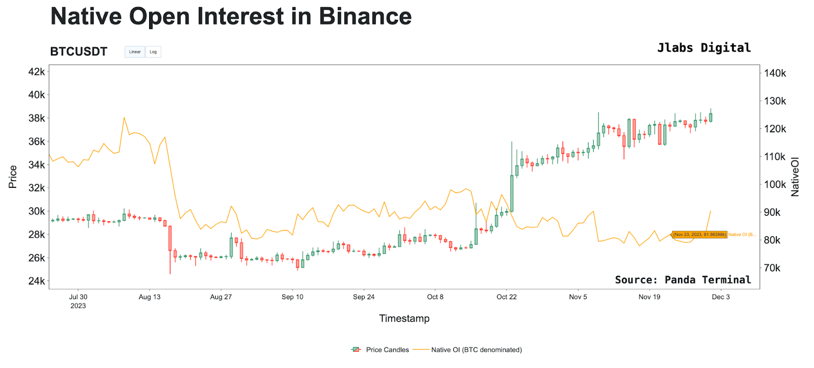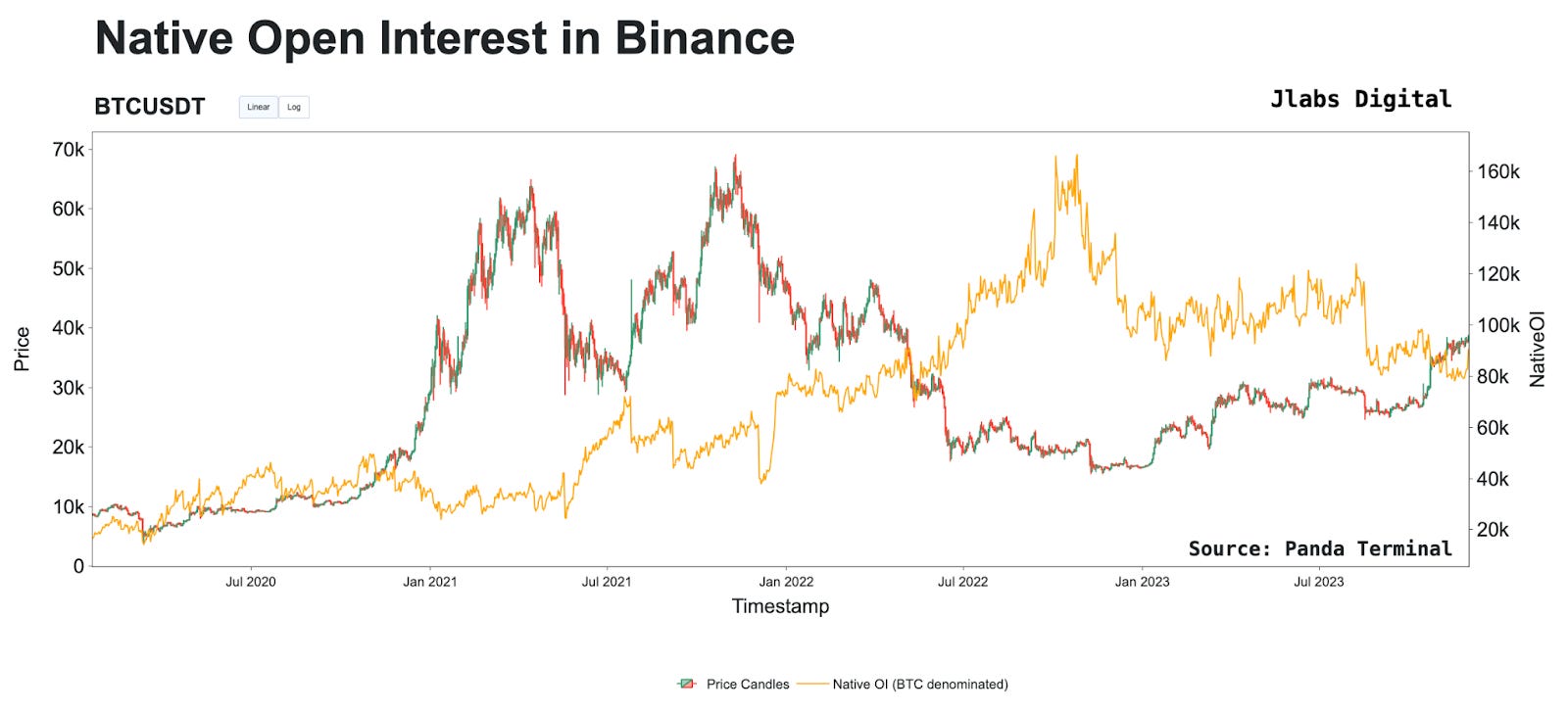 To set some definitions, native OI is the open interest measured in terms of Bitcoin. This means if the price of Bitcoin rises from $20,000 to $50,000, and only one Bitcoin contract is open, then OI (BTC) is equal to one.