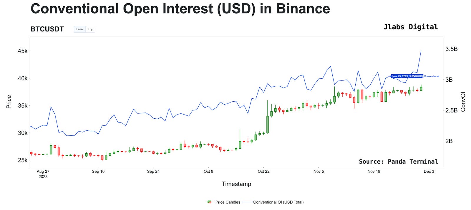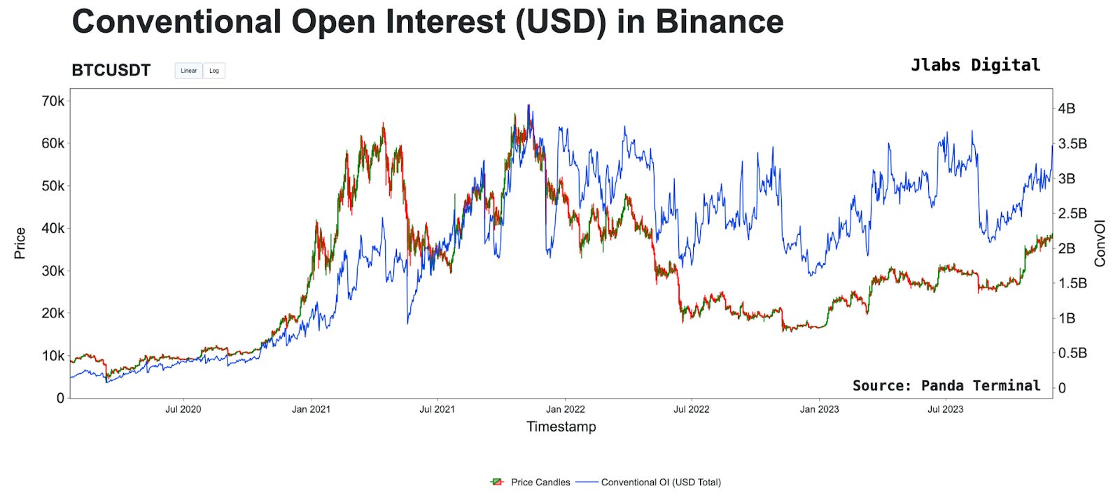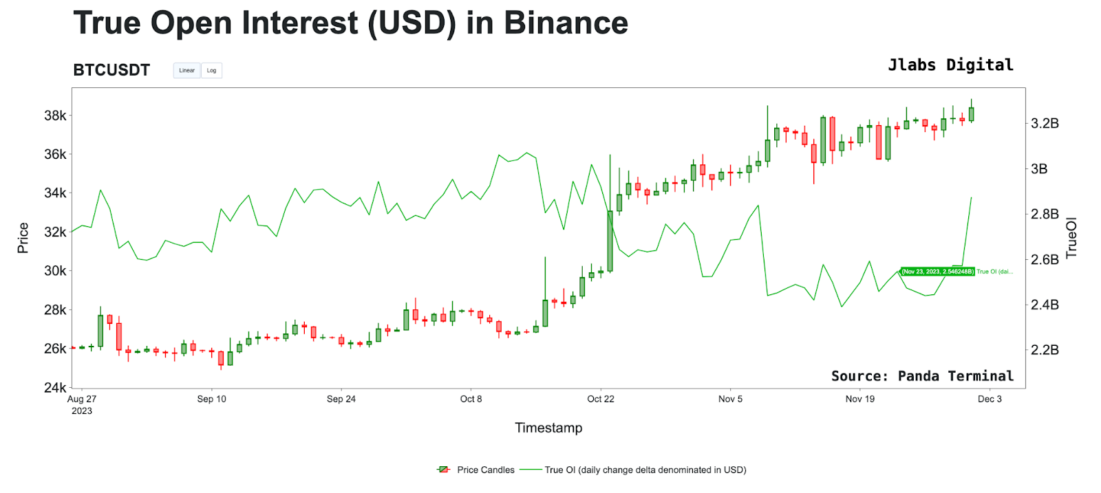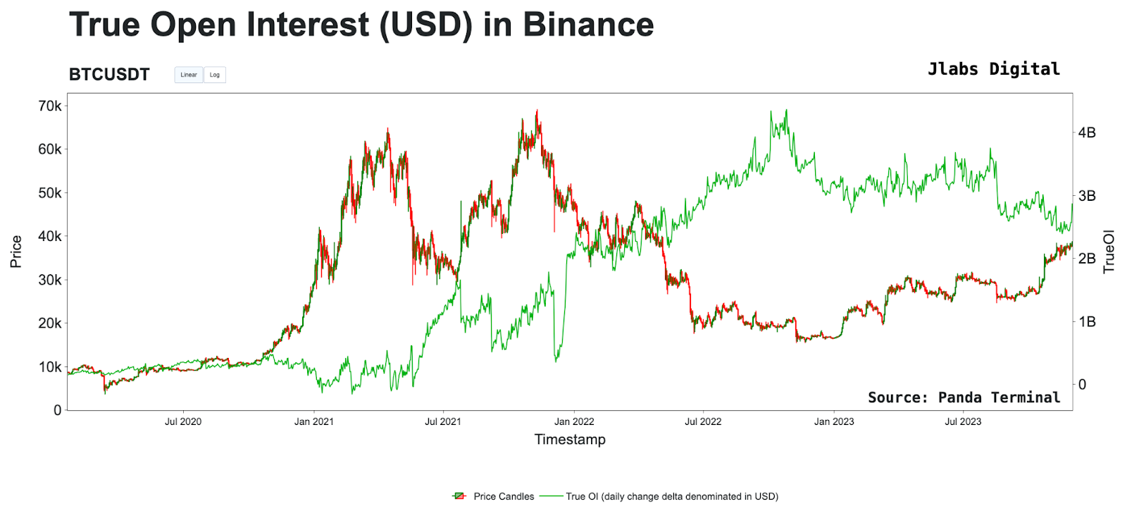 To combat this issue, Jlabs Digital created “True Open Interest.” True OI is calculated by taking the change or open interest delta, then multiplying it by BTC’s price at that time. This value is then added to the open interest on a rolling basis.