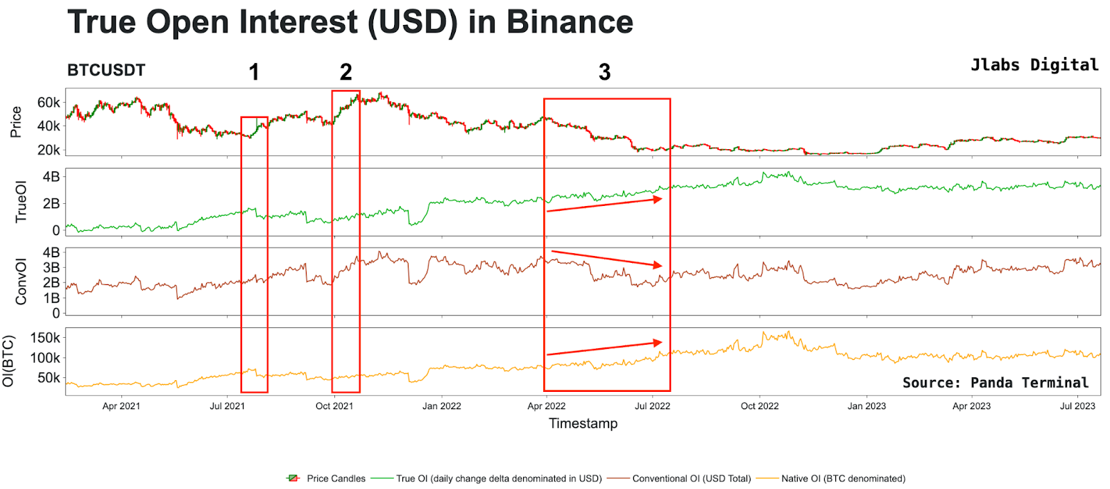 In box 1, we can see price rose, which impacted True OI and OI (BTC), as the price rise resulted in liquidations. But this had no impact on Conventional OI.