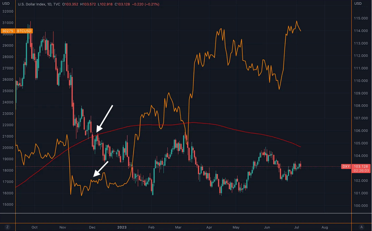 So as we saw, the dollar broke down below its 200-day moving average in December 2022. And if you went long Bitcoin there, you would've had an average entry price of around $16,000 or so, and you would've done quite nicely just playing on that. Correlation there: When one breaks down, the other goes up, and vice versa.