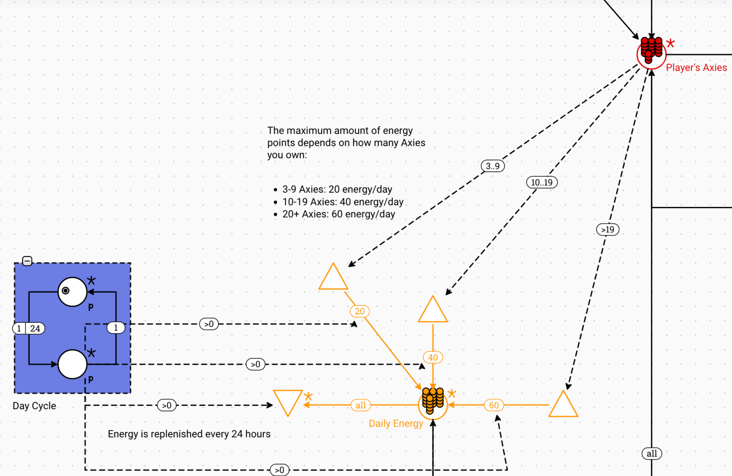 Now, starting from the left, there is a small module shaded in blue that tracks the passing of a day. The 1|24 connection is a delay of 24 steps; once those 24 steps have passed, the resource (the little solid ball) on the pool above moves to the pool below. This activates the dashed >0 lines. The drain will absorb whatever energy points are left in the Daily Energy pool. Then, one of the sources will send either 0, 20, 40, or 60 energy points depending on the amount of Axies the player holds on the red resource pool on the top.
