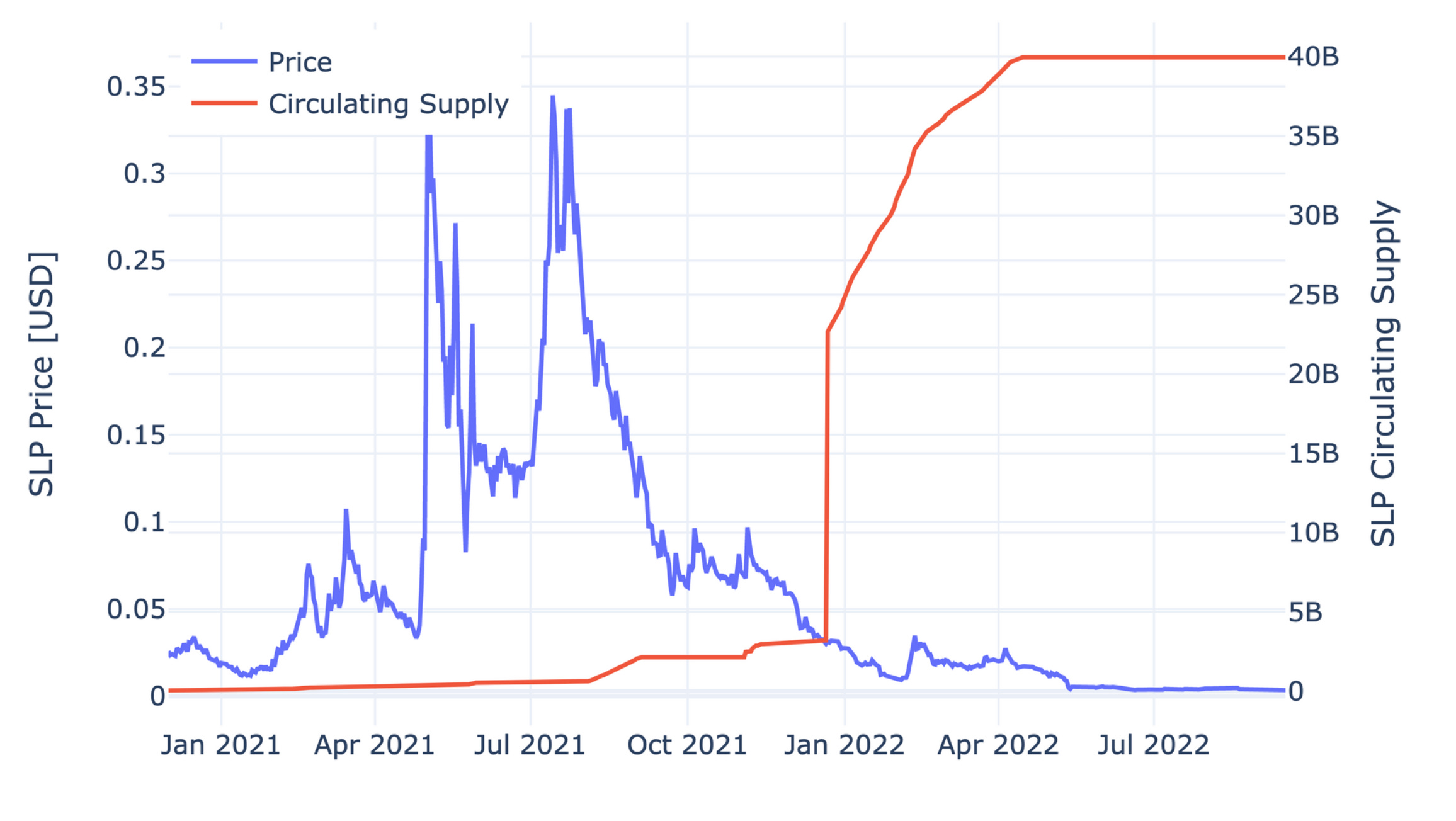 - SLP finds willing buyers at the start of the simulation. However, as time passes, the demand for SLP decreases as the token is farmed. This means the supply of SLP sold on exchanges (modeled as an AMM) increases.