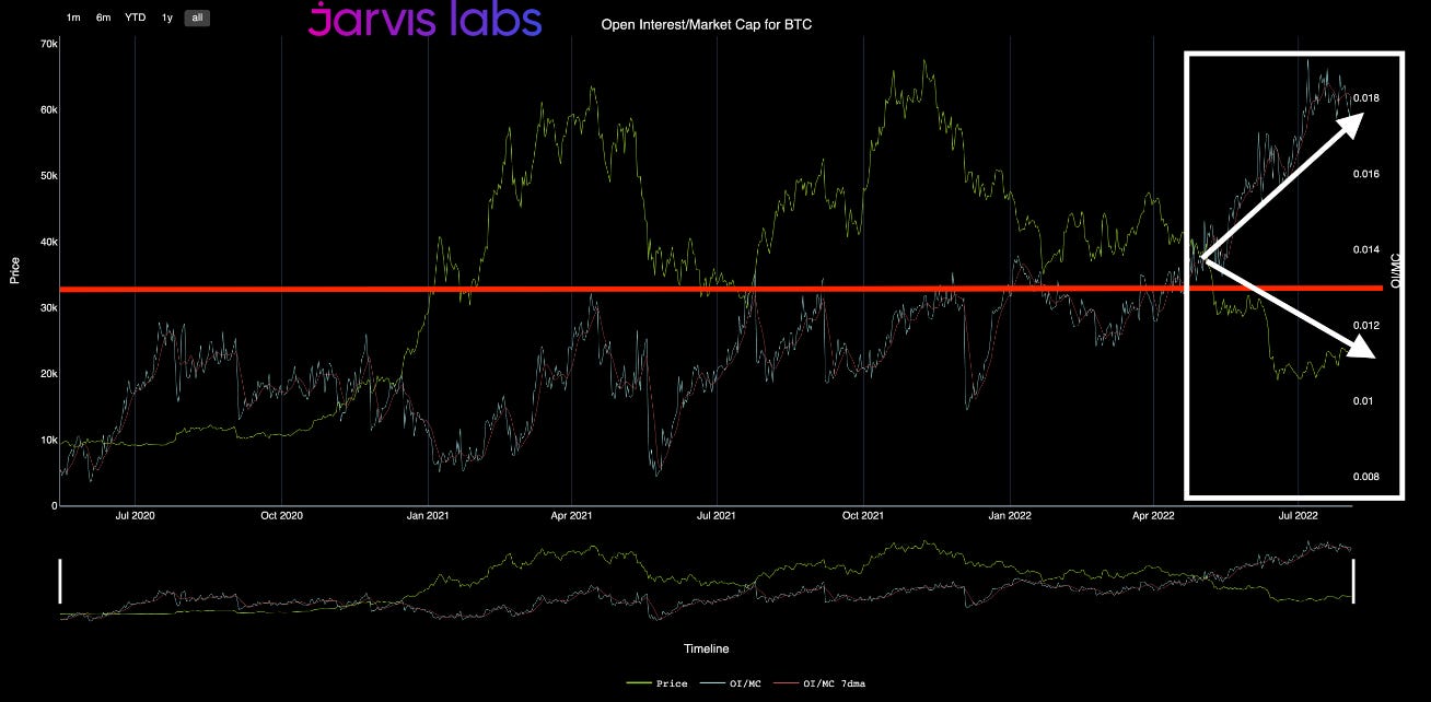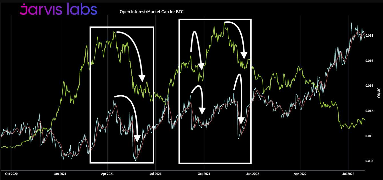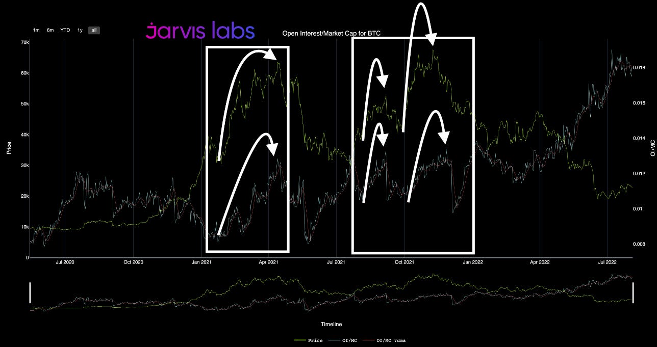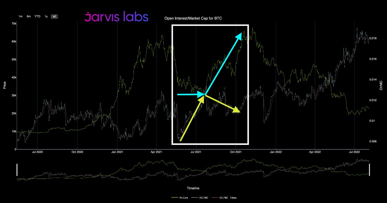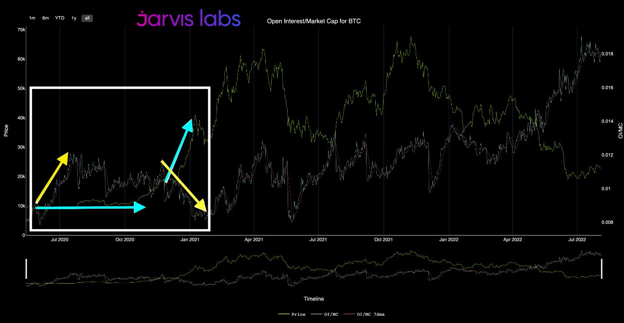 It happened in the second half of 2020. Which was also the first time OI (first yellow arrow) was more than 1% of market cap. This unfolded while BTC price stagnated in the $10k range (blue arrow).