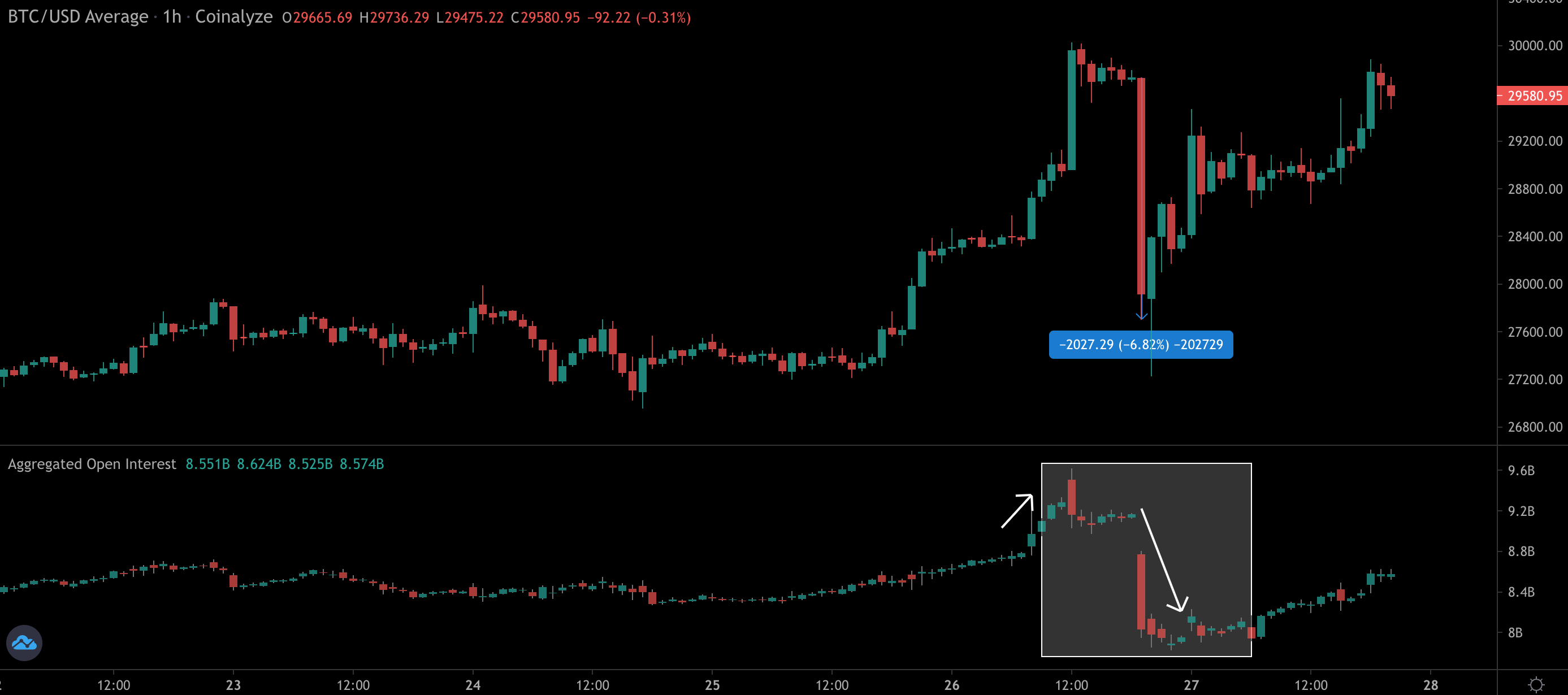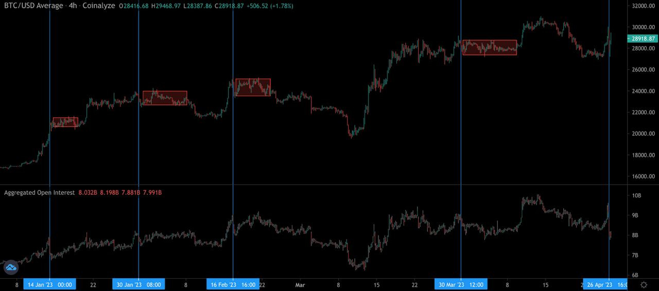 Below is a year-to-date chart of BTC with OI on the bottom. Each blue line marks a time when we saw a steady rise in OI followed by a major drop in both OI and price.
