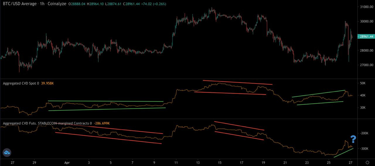 When looking for a hint as to what direction price will take next, we can turn to cumulative volume delta (CVD) of both spot and derivative trading.