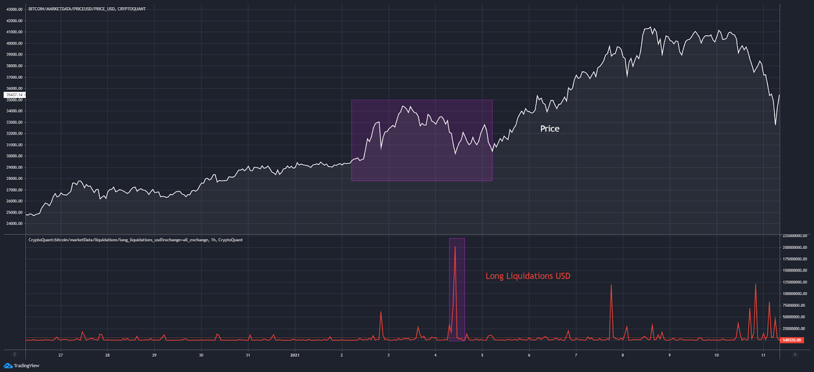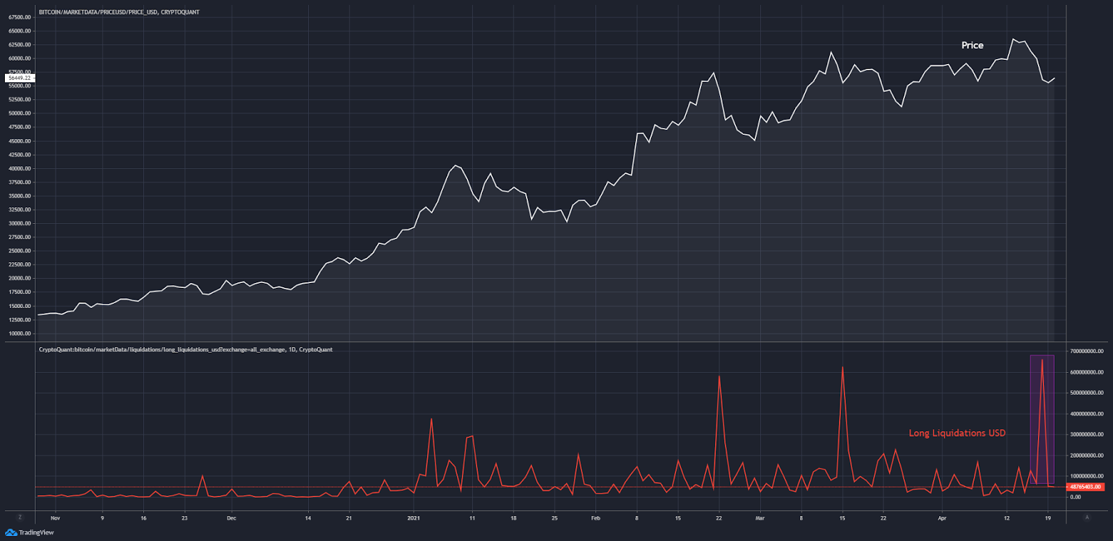Those that missed the signal became collateral damage in what was the largest liquidation event in the bull run at the time. You can see the liquidation figure in the red line within the chart below.