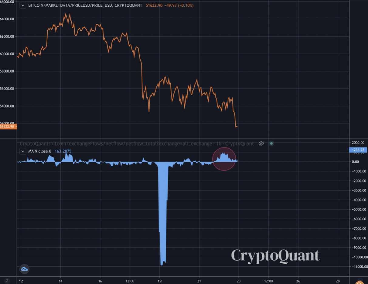 Last minute update: (Ben here) - Bitcoin dropped to $51k prior to publishing. This piece was written about three days ago. Here are the netflows for bitcoin as it sat on support, notice the red circle. Bitcoin was flowing into exchanges as price tested support - bearish.