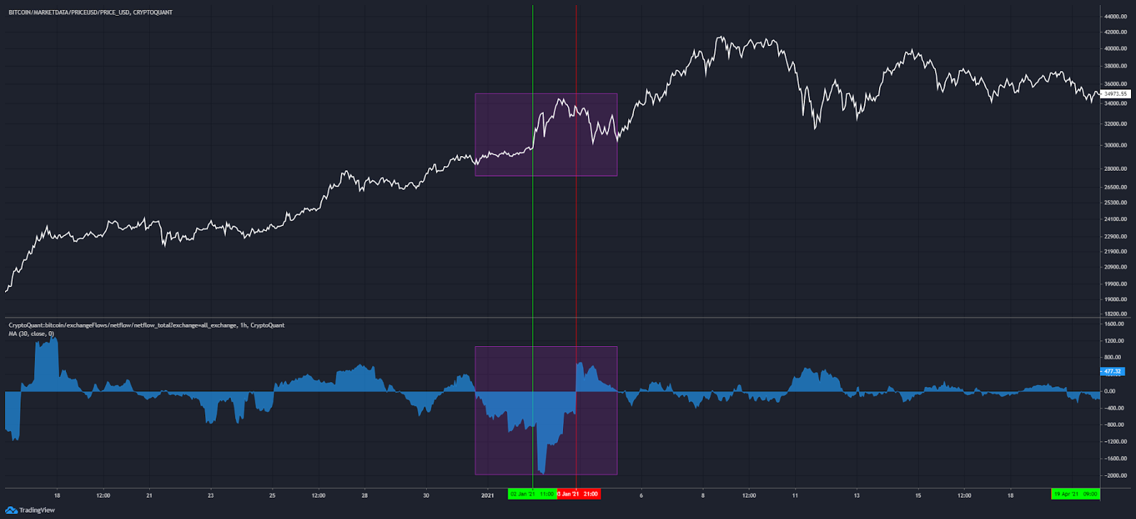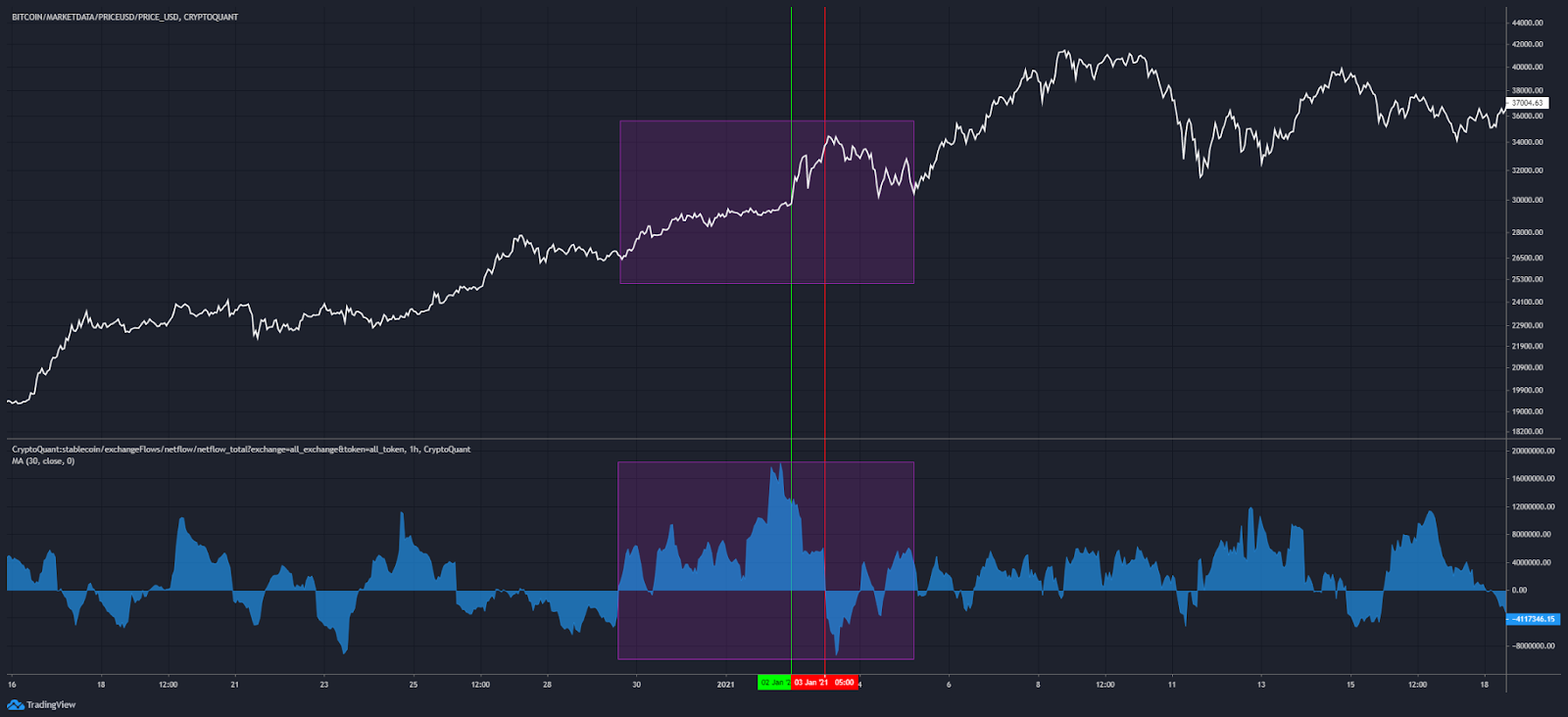 In the chart below I’ve added netflow total to the bottom half and then applied a 30-day moving average to smooth it out. The white line is price.