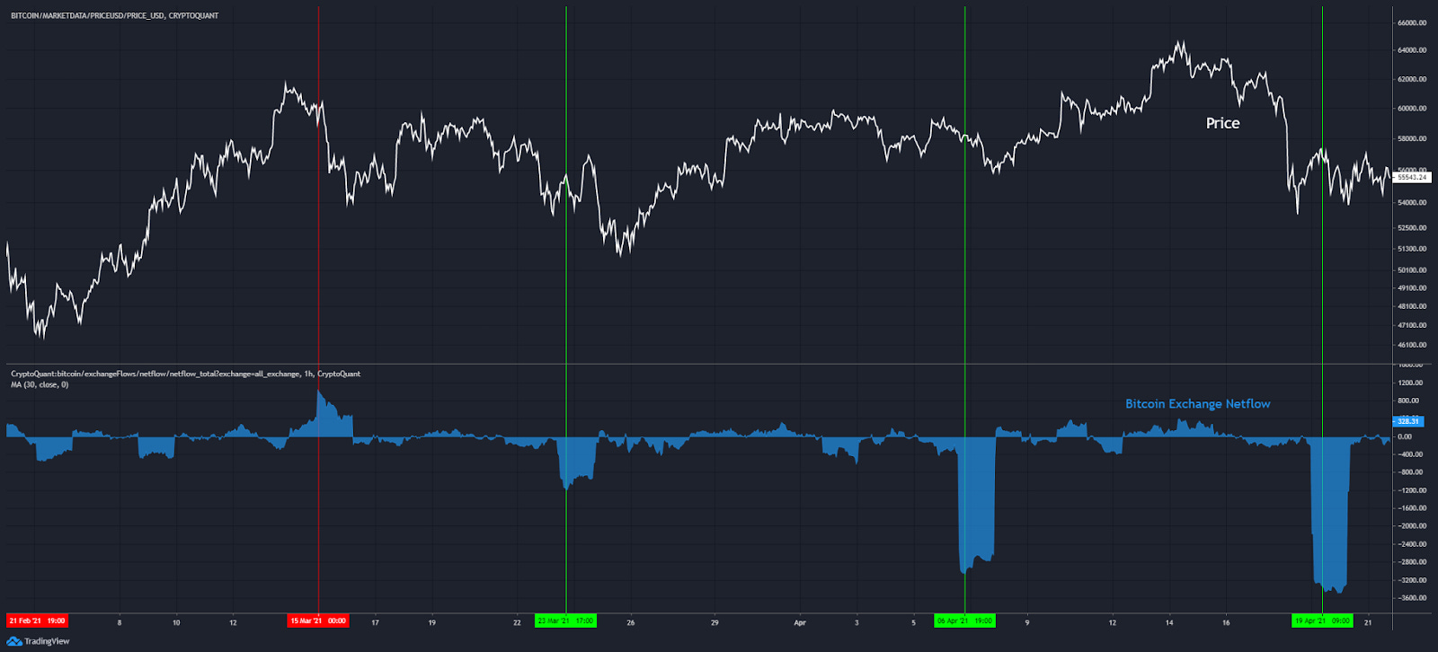 What’s interesting is the signals for this price action were seen on-chain both before and after the breakout. To find it I’ll pull up a chart with exchange netflow. It’s the difference between inflows and outflows. A negative number indicates the exchange has less bitcoin or stablecoins than it had prior.