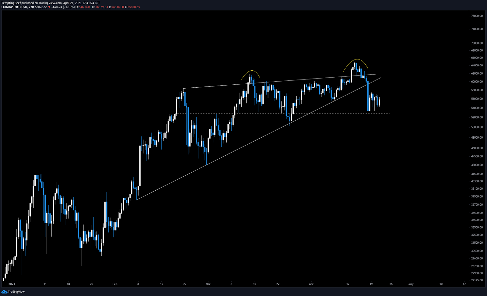 Bitcoin recently tried breaking out last week around the time of the Coinbase listing. It was rejected and subsequently broke to the downside. Support was found around 53k.