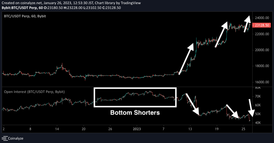We know this because once price (top graph) began to pump off of the bottom around January 10, open interest (bottom graph) on Bybit suffered a steep drop (indicated by the first up and down arrows).