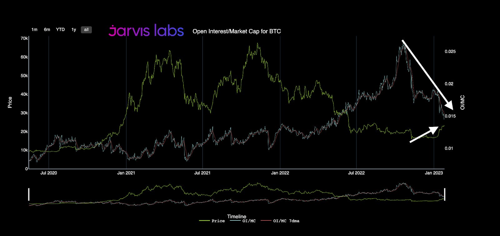 That’s the last time we saw such a similar level of BTC price suppression via open interest (white arrows on the left, below), and it happened in the months prior to Bitcoin reaching an all-time high.
