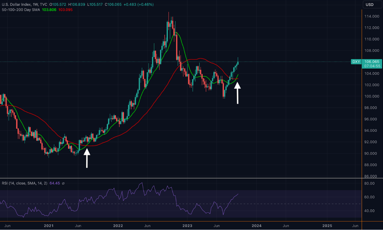 To add insult to injury and make BTC’s Q4 prospects even worse, DXY has recently experienced the inverse of BTC’s death cross, registering a golden cross (when the 200-day MA falls below the 50-day MA) on its weekly chart for the first time since June 2021.