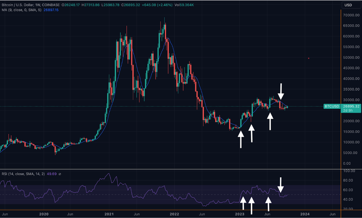 As we see on the chart below, Bitcoin carried both the “9, close, 0, SMA, 5” trend line (blue line) and >50-RSI weekly mark (purple line) throughout its 2023 uptrend, before losing them both just prior to August’s brutal crash from $29,000 to below $25,000.