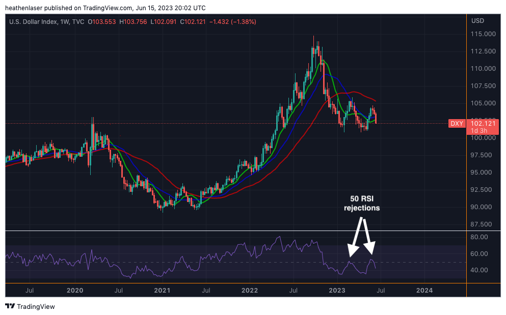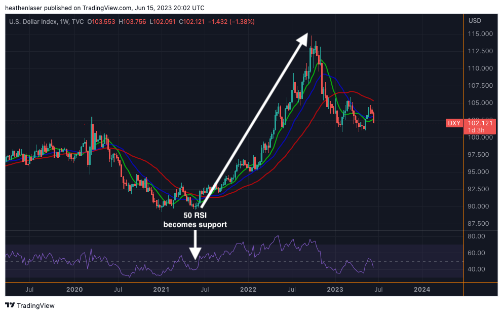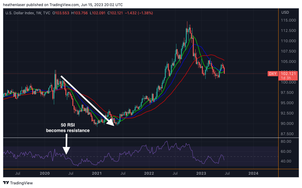 Now, after retesting that 50 RSI level for the second time in 2023 and failing again, it appears this level has become firm resistance.