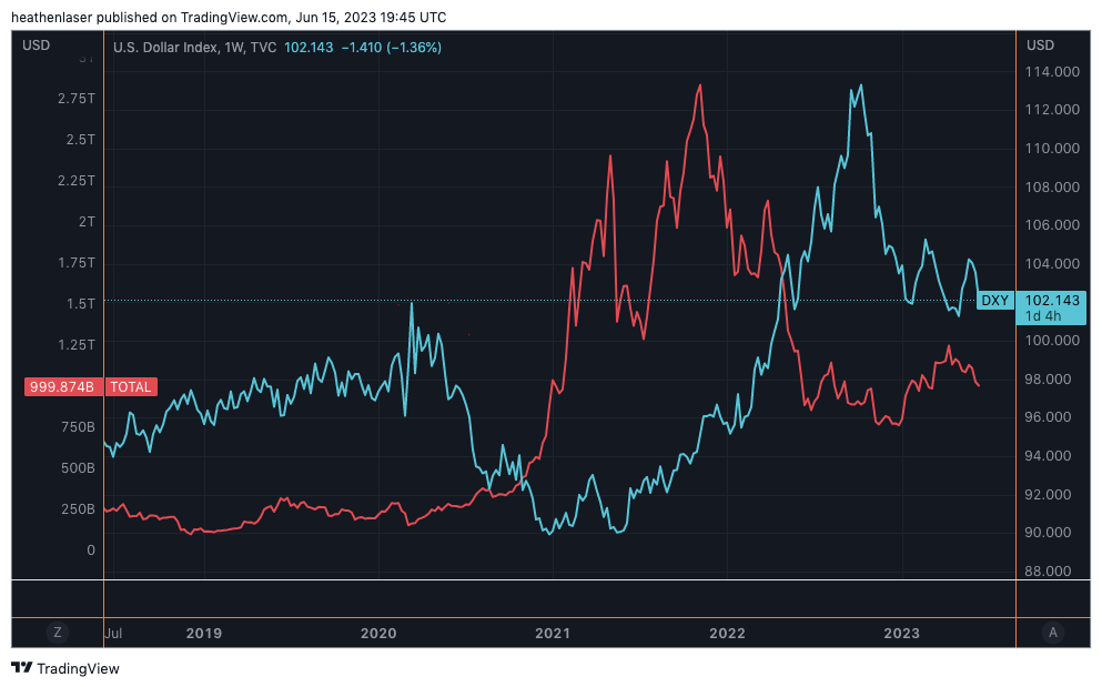 That’s why BTC and risk assets have had their strongest bull runs during DXY bear markets. Take a look at the chart below comparing DXY (blue line) to total crypto market cap (red line) to see what I’m talking about.