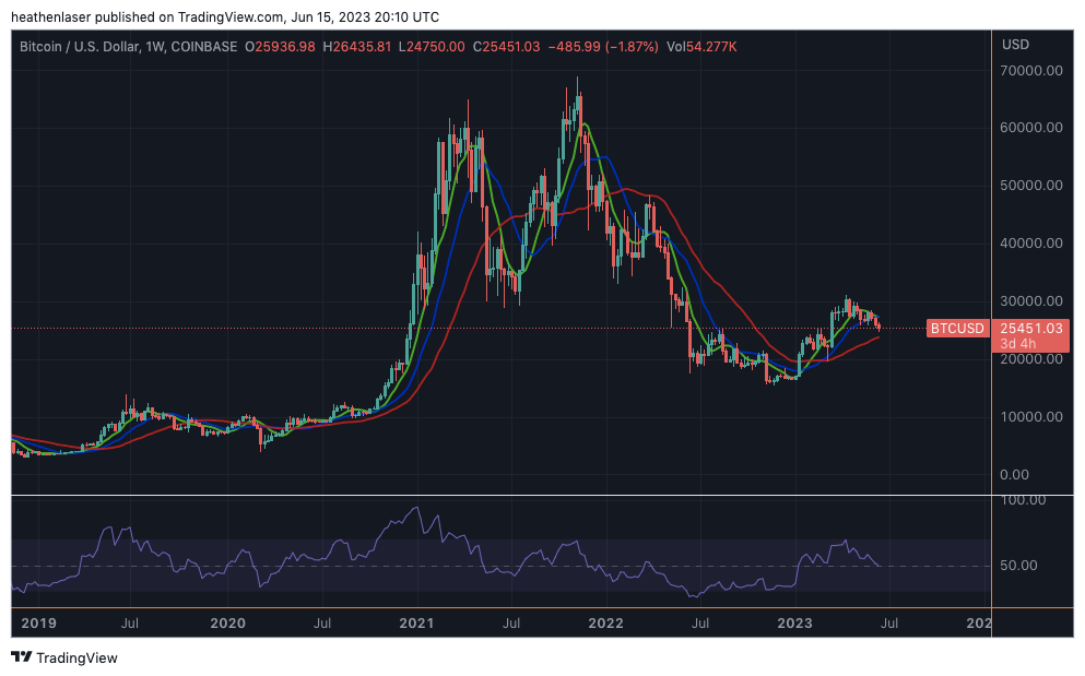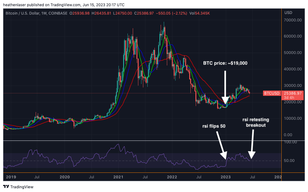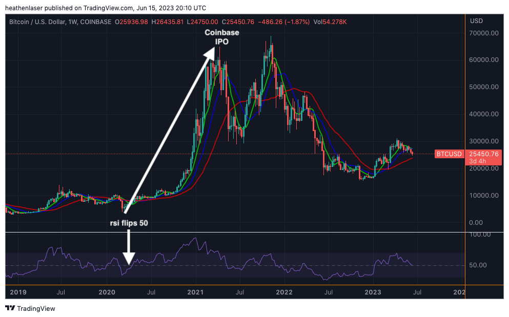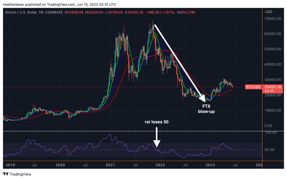 Then, in late 2021 after the all-time high peak, we saw RSI fall below 50, where it stayed throughout the brutal 2022 bear market which culminated with FTX’s collapse.