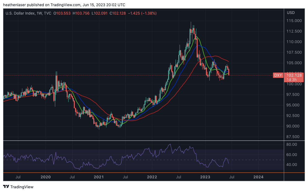 But with the Fed’s actions this week in pausing rate hikes (plus inflation cooling), it looks like the dollar’s days above 100 may be numbered.