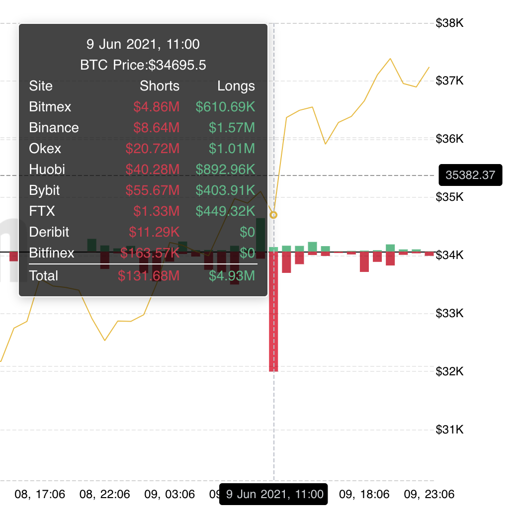 Here’s a hour by hour liquidation chart. In the hour where the most liquidations took place we saw price jumped about $2k. And breaking this down on a regular chart, we can see it took place in less than 30 minutes.