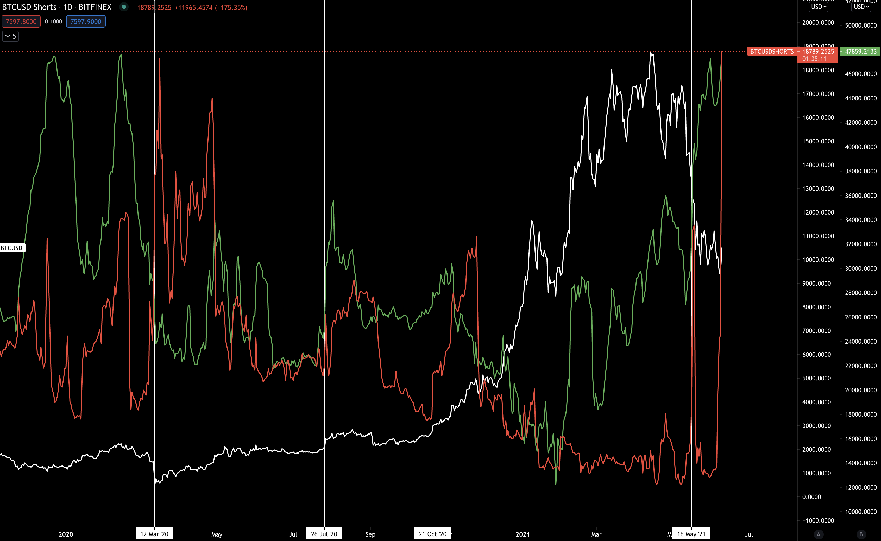 The white vertical lines pair up with big changes in shorting interest.