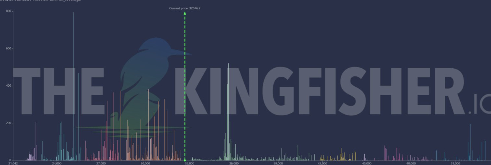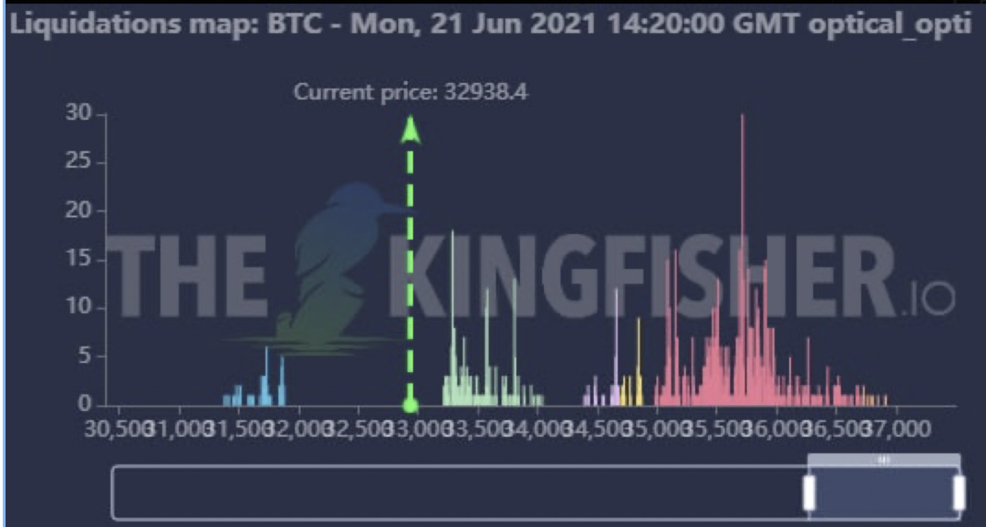 According to the guys over at The Kingfisher, there is a stack of liquidity to the downside. The chart above is zoomed out so the bars to the left of the vertical green line represent areas in which longs get liquidated.