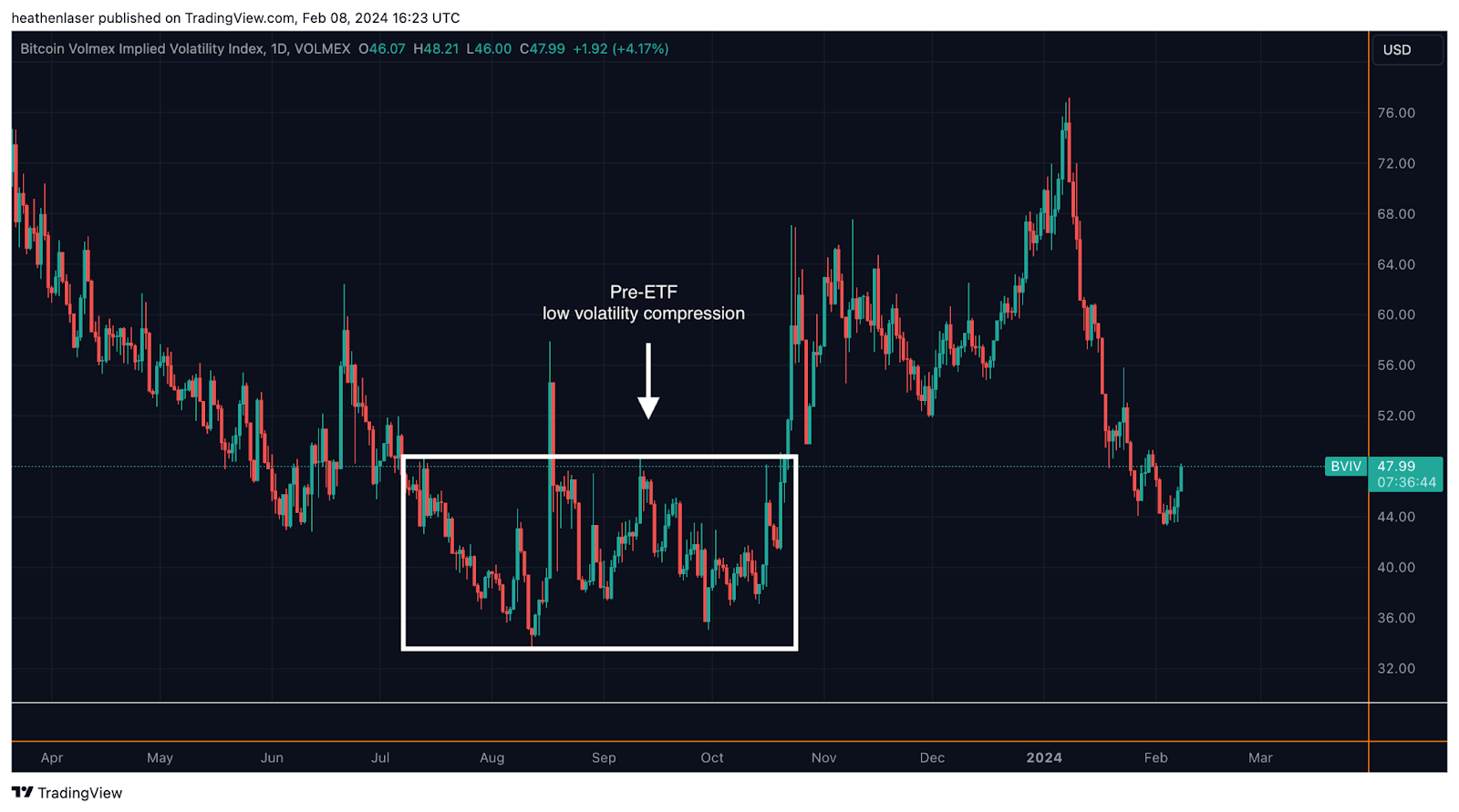 Which means we have a potential signal that our current period of low, compressed volatility levels may be nearing its end and a spike in BVIV may come as soon as March, which implies that price could soon expand beyond its current range of $39,000-$45,000.