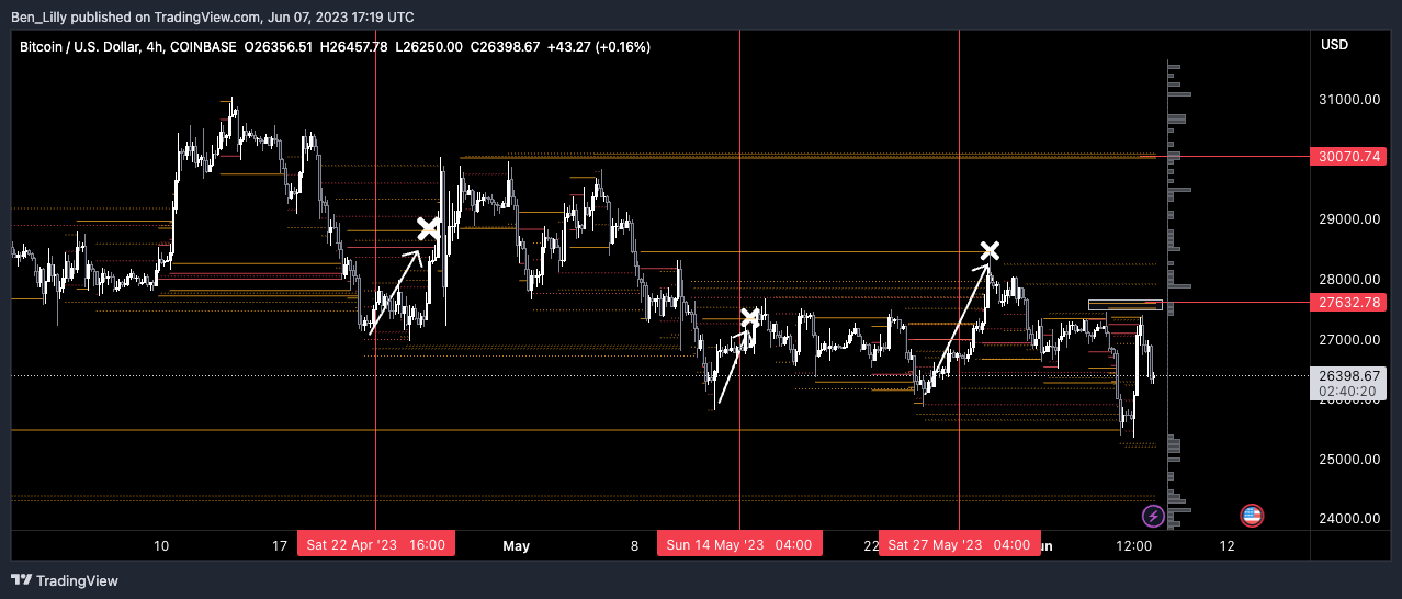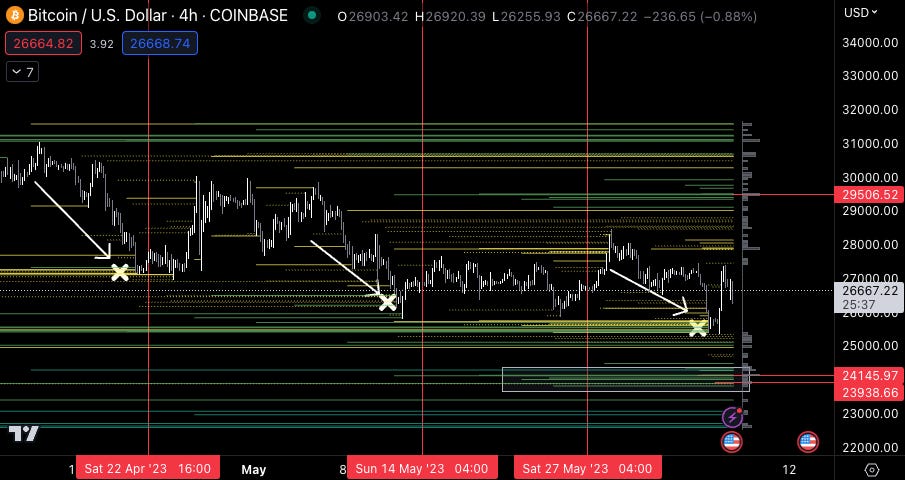 If we start by looking at the downside, we can see how price is taking out these pools (white arrows and X’s) just before those red vertical lines. These are those vertical lines I pulled from the chart you saw just prior.