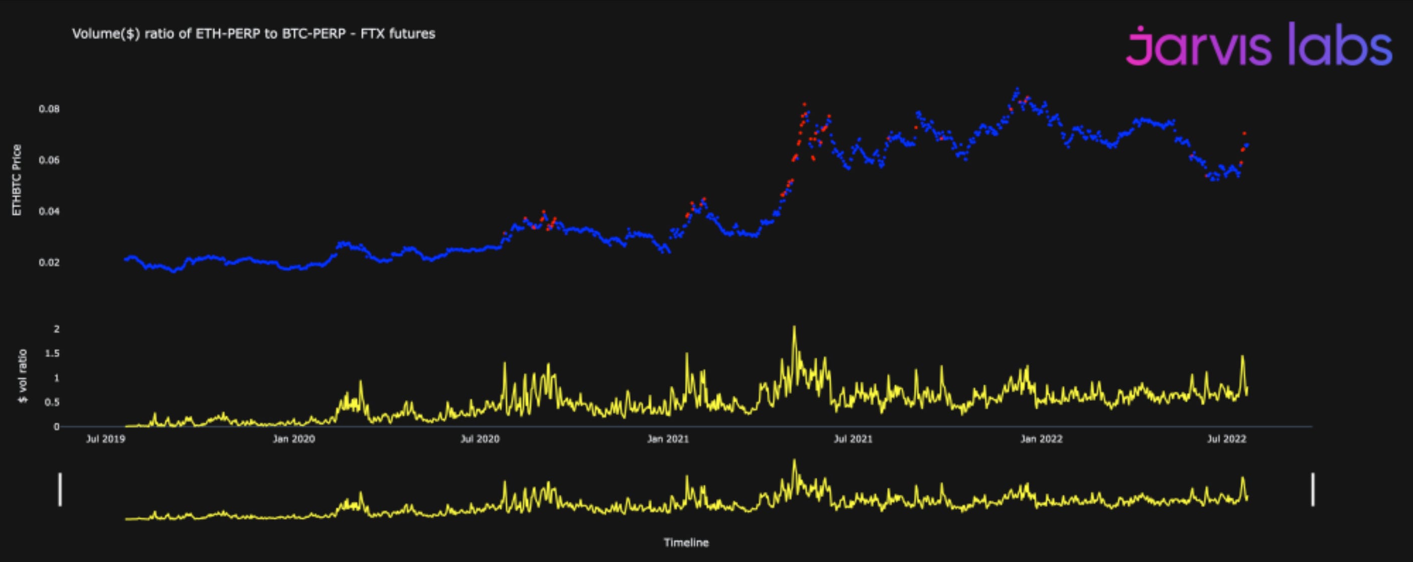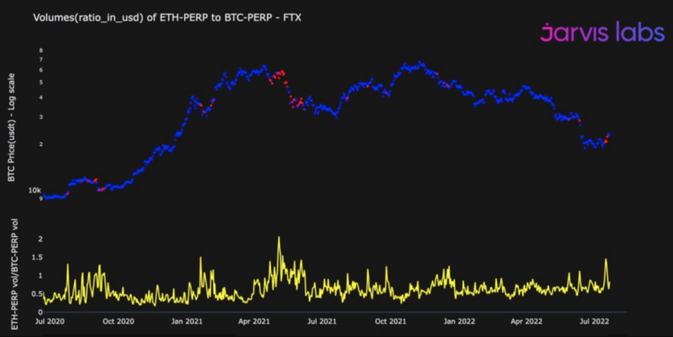 The yellow line on bottom represents the volume ratio of the ETH-perp vs BTC-perp contracts on FTX.