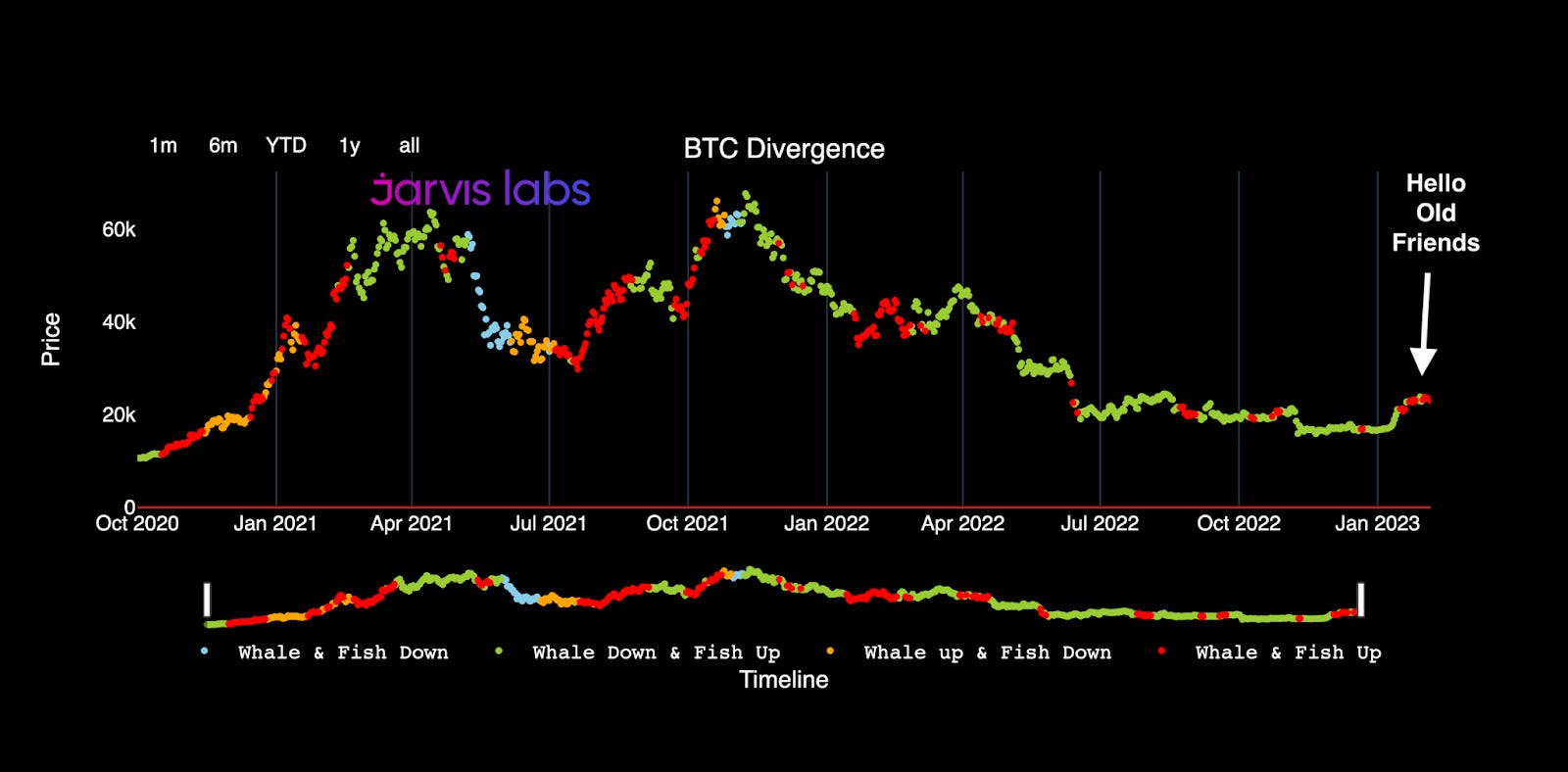 Additionally, we’ve seen the return of large whale wallets on our divergence charts (as indicated by the red dots below, white arrow on the right), which signals big money movers have been accumulating to start 2023.