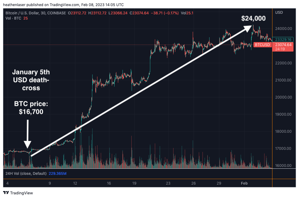 Meanwhile, BTC skyrocketed from the $16,000 range in early January to over $24,000 by month’s end.