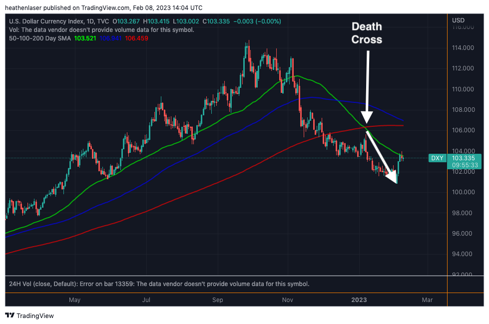 As we discussed back in early January, the U.S. Dollar Index (DXY) has been in a firm downtrend since Q4 2022. This was confirmed when the dollar hit a death cross on January 5.