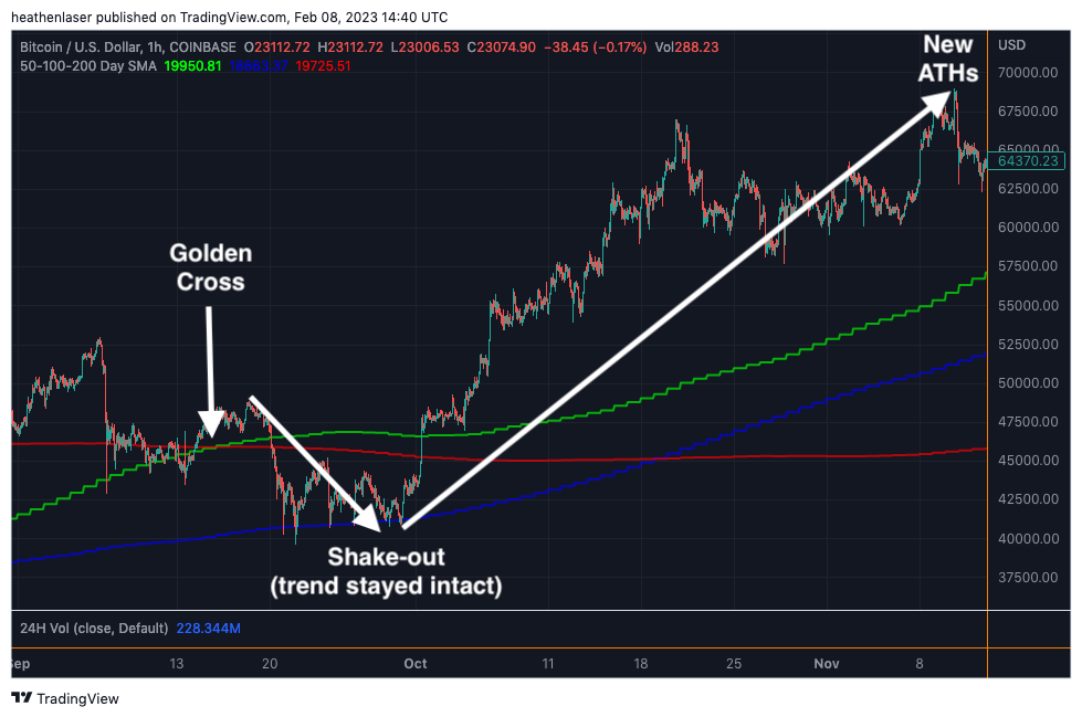 A common pattern we found while taking a look at BTC’s past golden crosses.